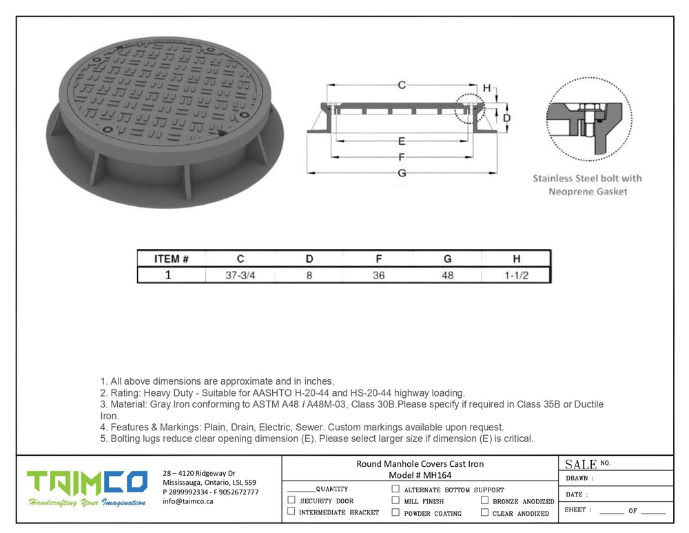 Round Manhole Cover and Frame Gray Iron Bolted & Gasketed Model # MH164