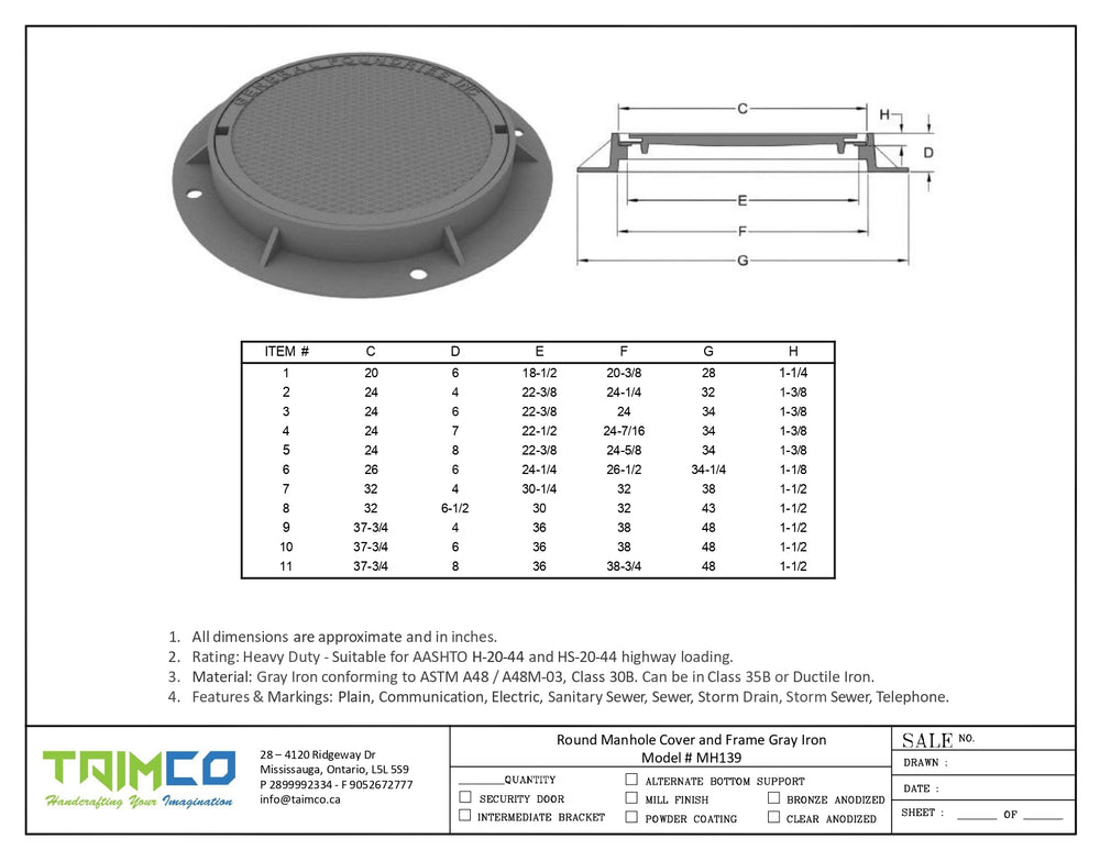 Material: Gray Iron conforming to ASTM A48 / A48M-03, Class 30B. Can be in Class 35B or Ductile Iron.