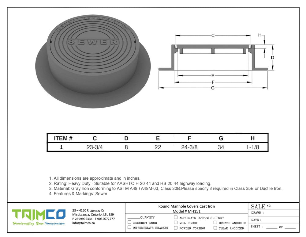 Material: Gray Iron conforming to ASTM A48 / A48M-03, Class 30B. Can be in Class 35B or Ductile Iron.