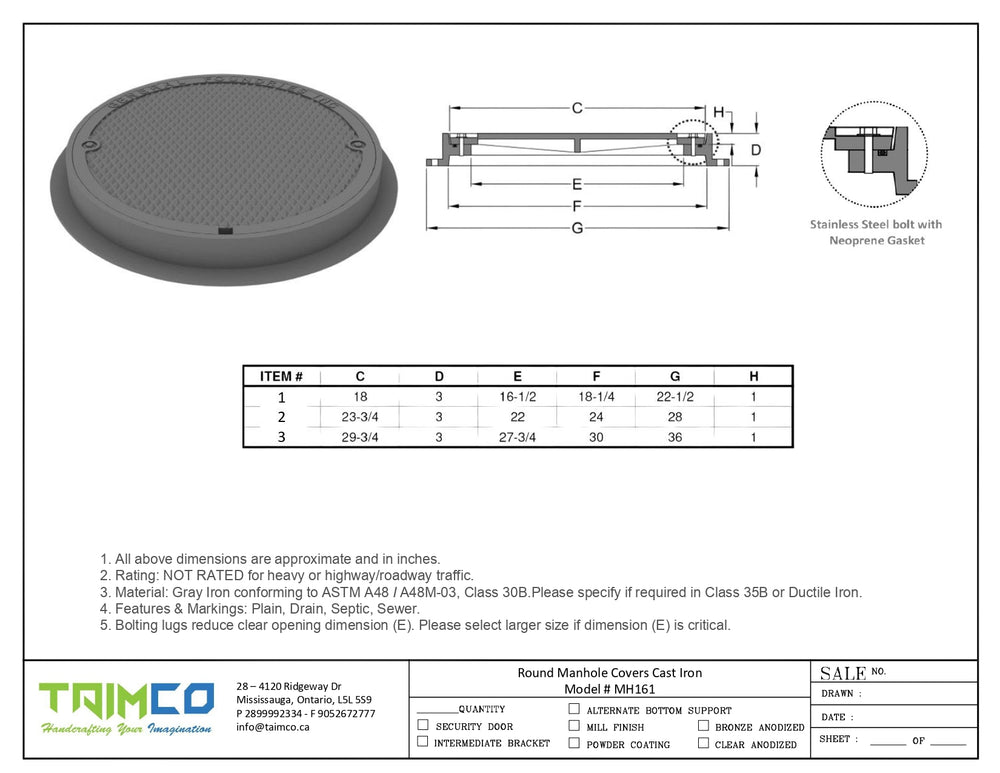 TAIMCO Round Manhole Covers Gray Iron Light Duty Bolted & Gasketed Model # MH161