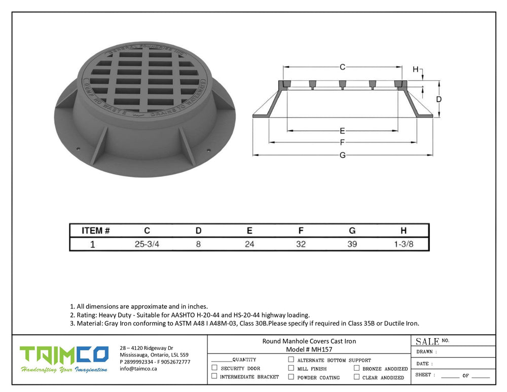 Material: Gray Iron conforming to ASTM A48 / A48M-03, Class 30B. Can be in Class 35B or Ductile Iron.