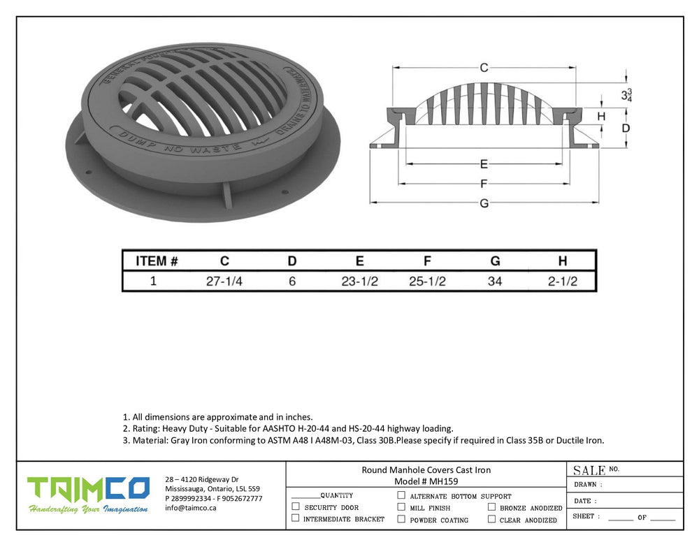 - Material: Gray Iron conforming to ASTM A48 / A48M-03, Class 30B. Can be in Class 35B or Ductile Iron.