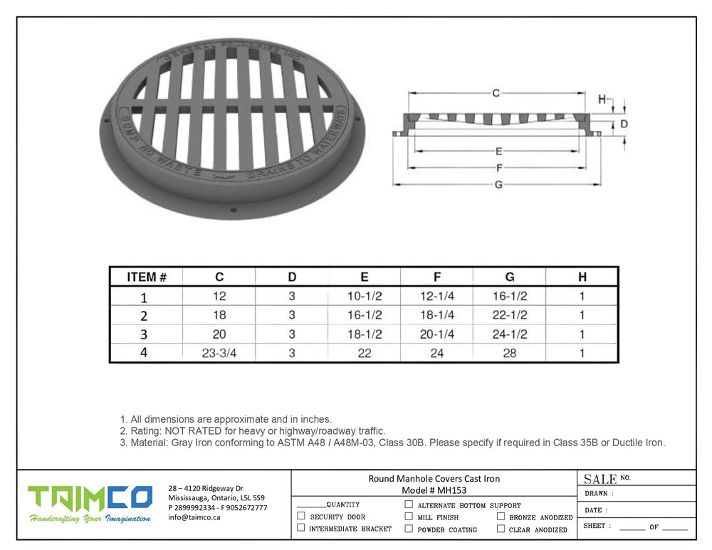 Round Manhole Covers Cast Light Duty Iron Model # MH153