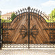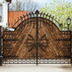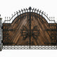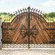 A gate that honors the hand and the land. Timber crest Artisan features dual swing panels built from diagonally laid wooden planks in a chevron pattern, each piece hand-cut, stained, and sealed by skilled Canadian craftsmen. Wrought iron scrolls, spikes, and circular handles add ornamental contrast, while the arched top rail crowned with finials evokes old-world grandeur. Flanked by stone pillars topped with spherical finials, this gate is a tribute to timeless design and artisanal pride.