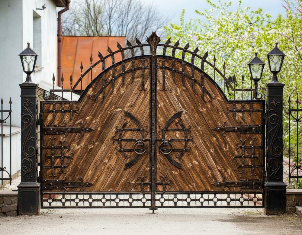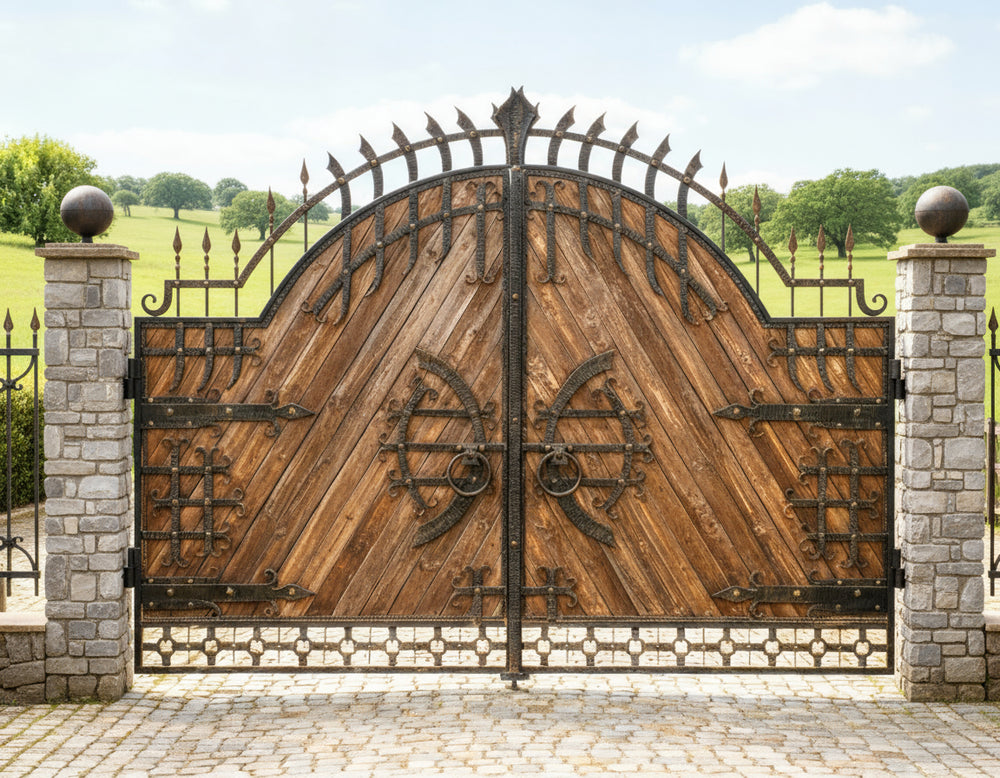 A gate that honors the hand and the land. Timber crest Artisan features dual swing panels built from diagonally laid wooden planks in a chevron pattern, each piece hand-cut, stained, and sealed by skilled Canadian craftsmen. Wrought iron scrolls, spikes, and circular handles add ornamental contrast, while the arched top rail crowned with finials evokes old-world grandeur. Flanked by stone pillars topped with spherical finials, this gate is a tribute to timeless design and artisanal pride.