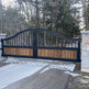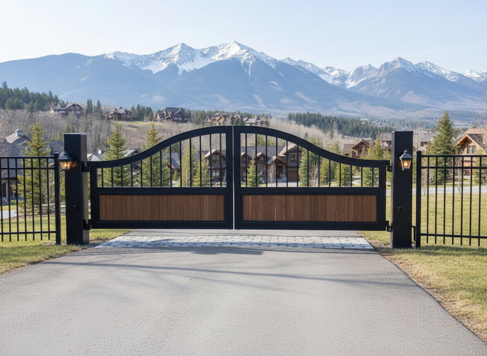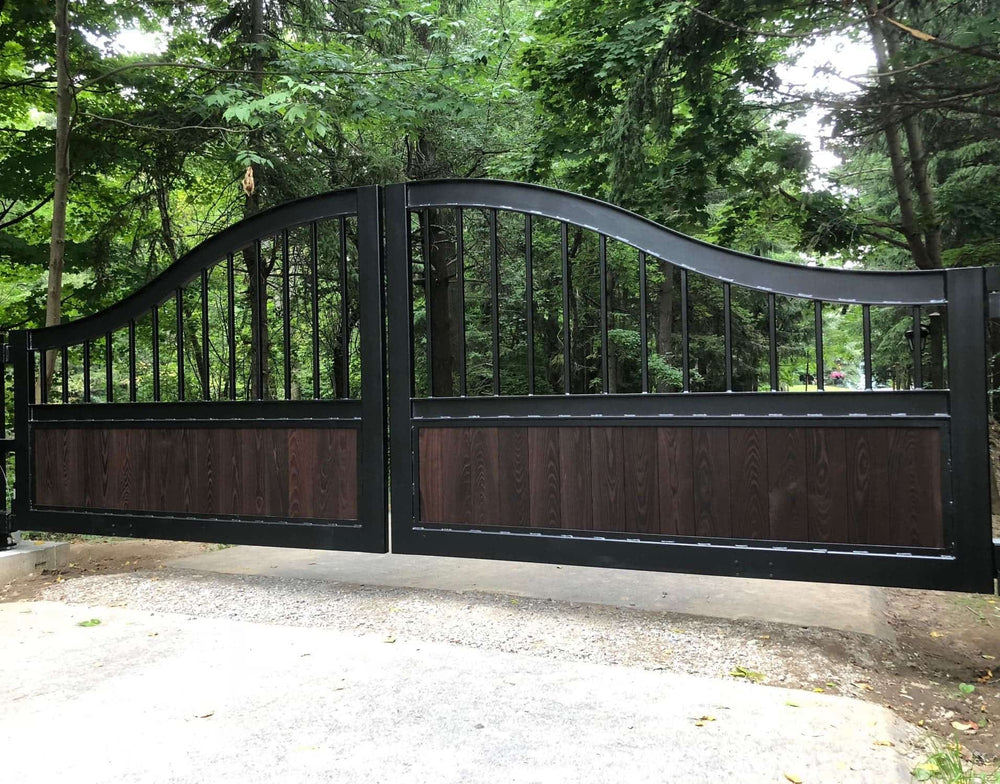 wood and steel driveway gate, rustic entrance gate, custom timber gate Canada, modern farmhouse gate, Taimco mixed-material gate, privacy gate with wood panels, forest estate gate, heavy-duty decorative gate, outdoor architectural gate