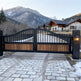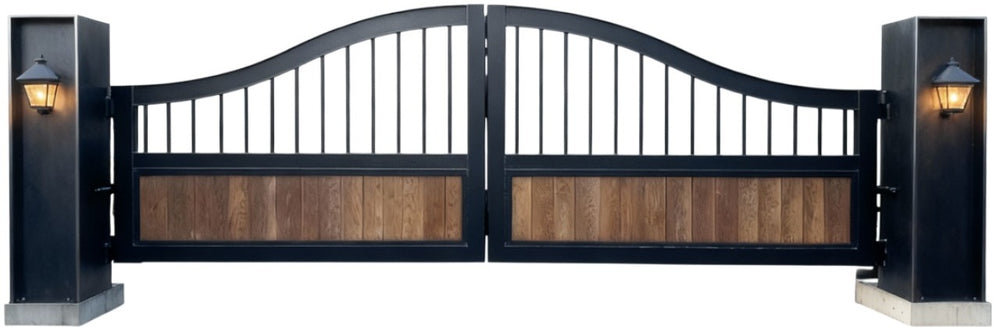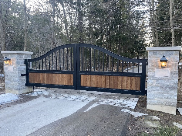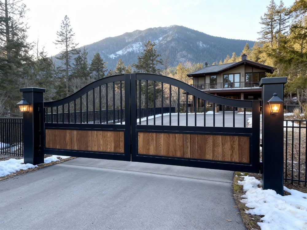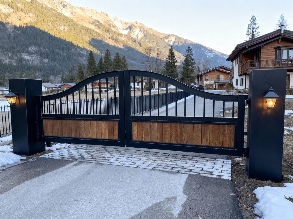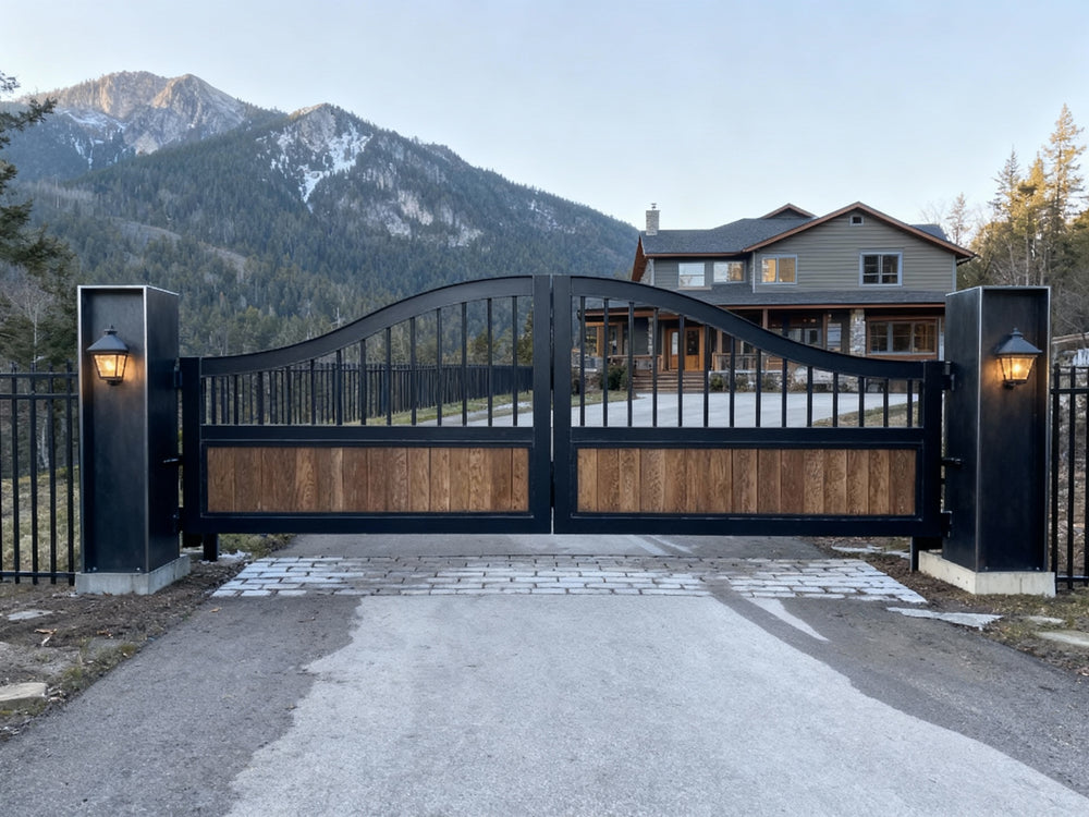 Welcome home with TimberGuard, a driveway gate that fuses rustic charm with modern durability. Featuring a black steel frame and vertical bars above rich wooden panels, this gate offers privacy, strength, and timeless appeal. Flanked by stone pillars and lantern-style lights, it’s the perfect entrance for forested estates, country homes, or properties that value natural aesthetics and architectural integrity.