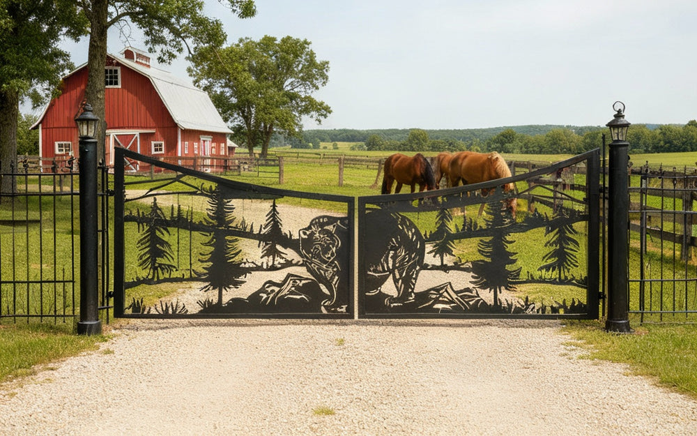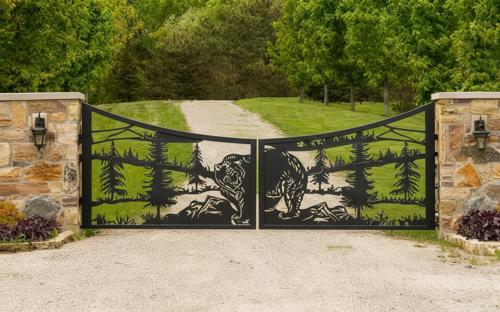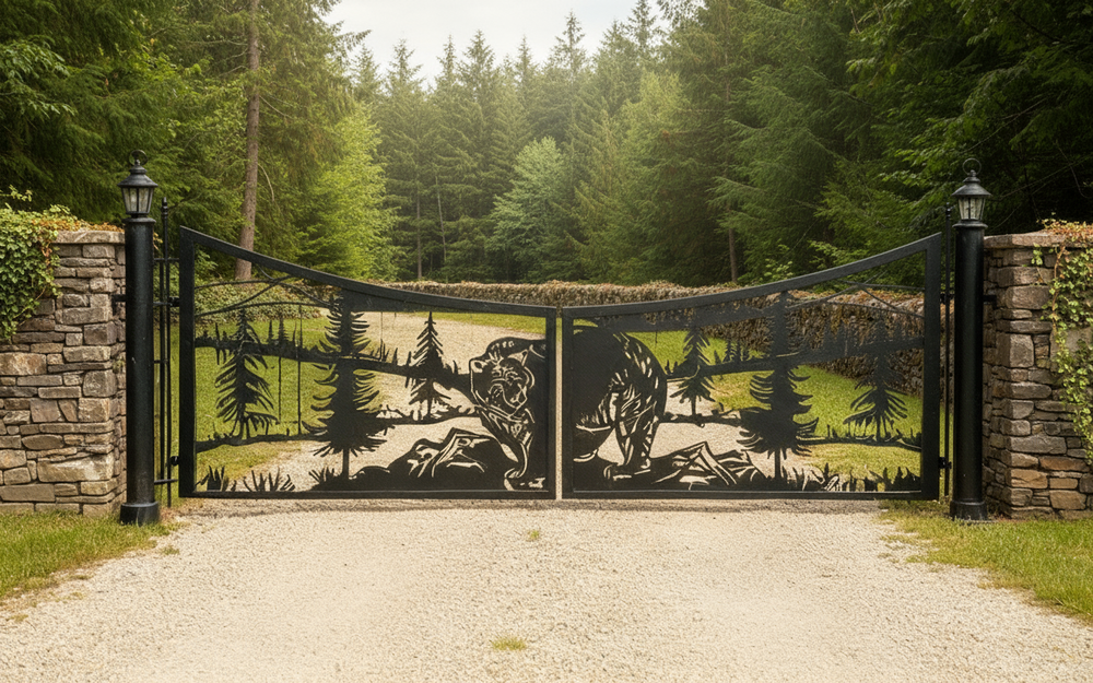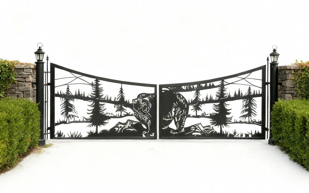 moose and bear driveway gate, forest silhouette wrought iron gate, custom steel entrance gate, Canadian wildlife gate, Taimco decorative gate, nature-inspired estate gate, heavy-duty artistic gate, wilderness lodge gate