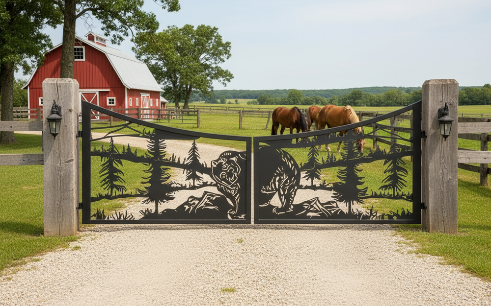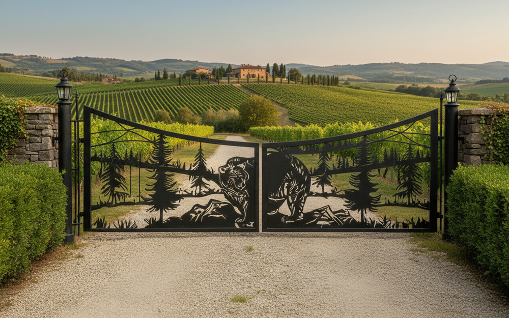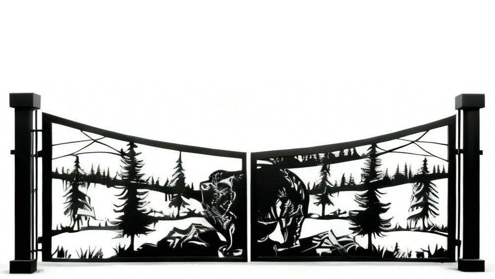 Let your entrance echo the call of the wild. Timber wild Crest features a symmetrical forest scene with towering pine trees, a moose on one panel, and a bear on the other—each rendered in high-contrast silhouette with layered depth and clean negative space. Designed for properties that embrace nature’s majesty, this gate is both a functional barrier and a sculptural statement—perfect for rural estates, hunting lodges, or wilderness sanctuaries.