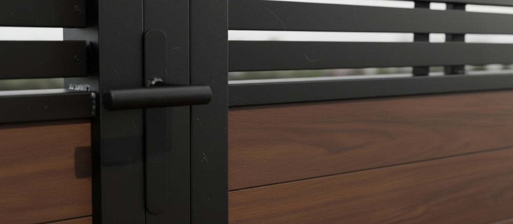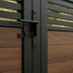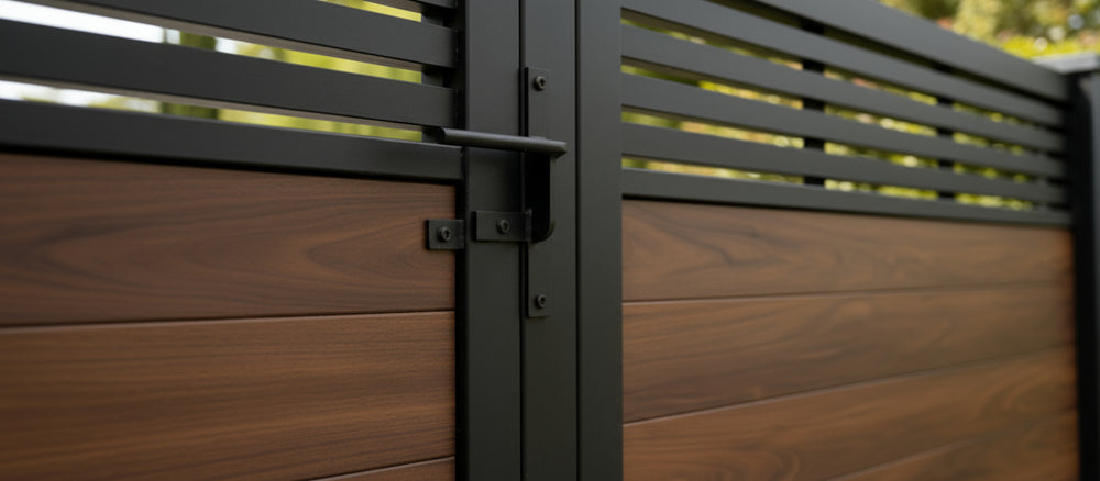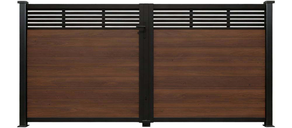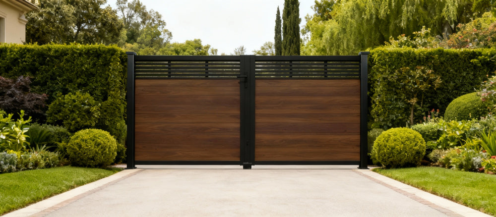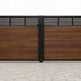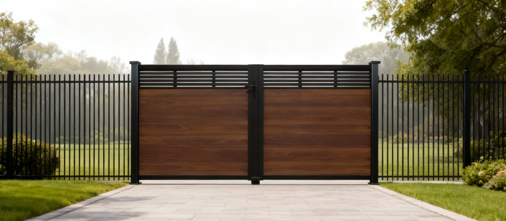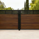 A gate that blends nature and structure. Timberline Horizon features dual swing panels framed in matte black steel, with rich horizontal wood slats below and evenly spaced metal slats above. The design offers privacy with partial visibility, creating a balanced aesthetic that complements modern architecture. This gate evokes warmth, strength, and contemporary refinement—perfect for driveways, courtyards, or perimeter control.