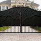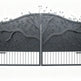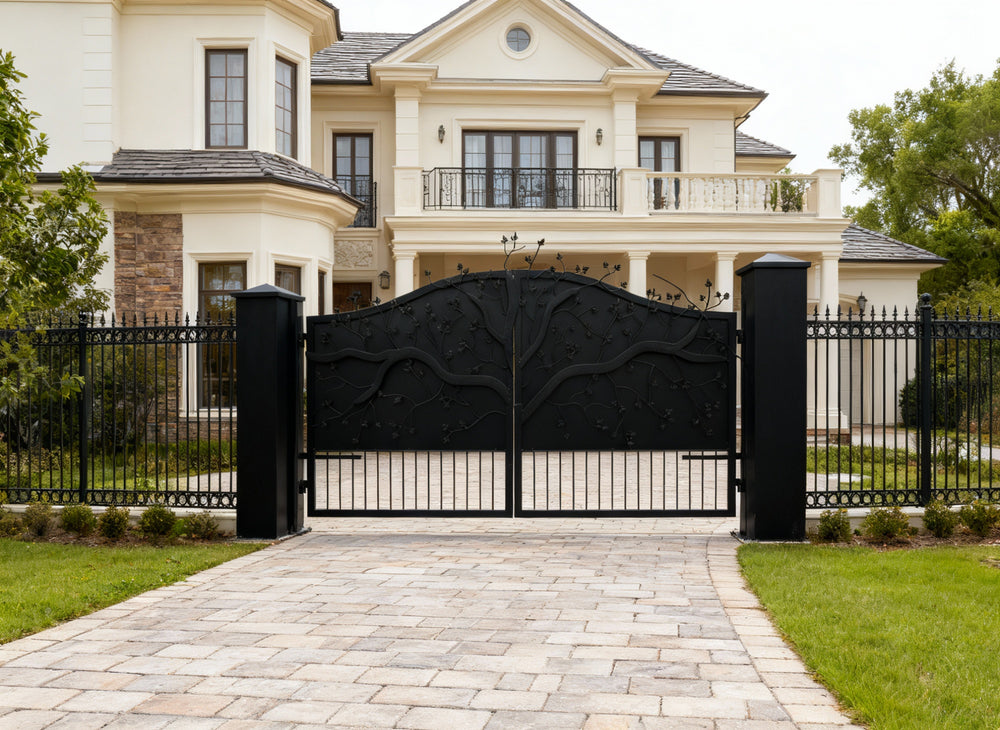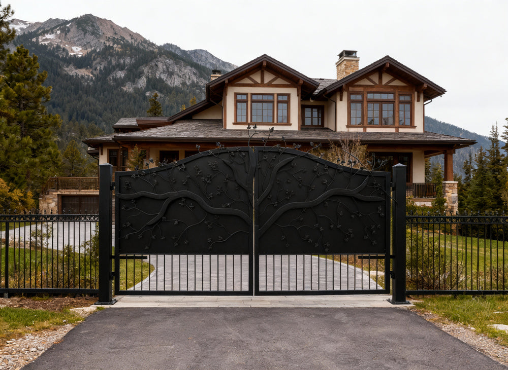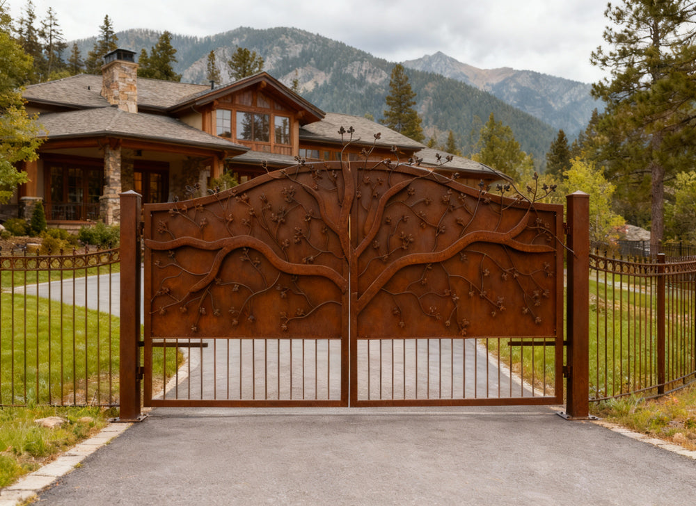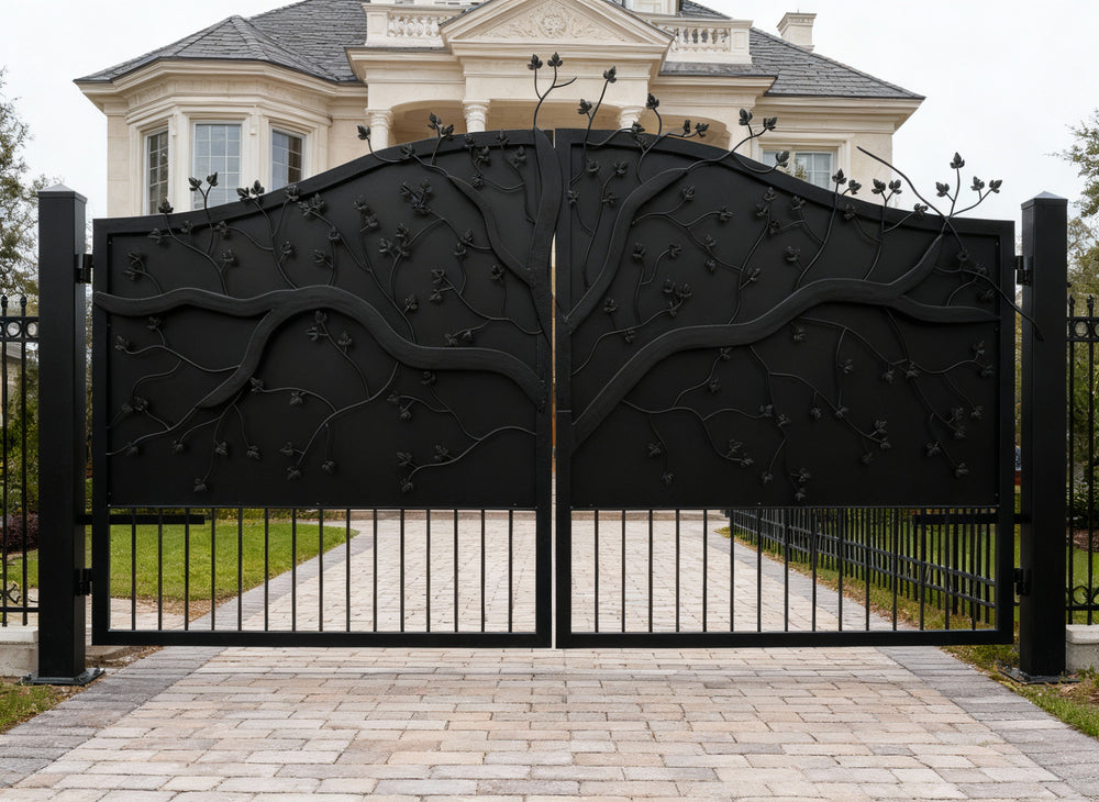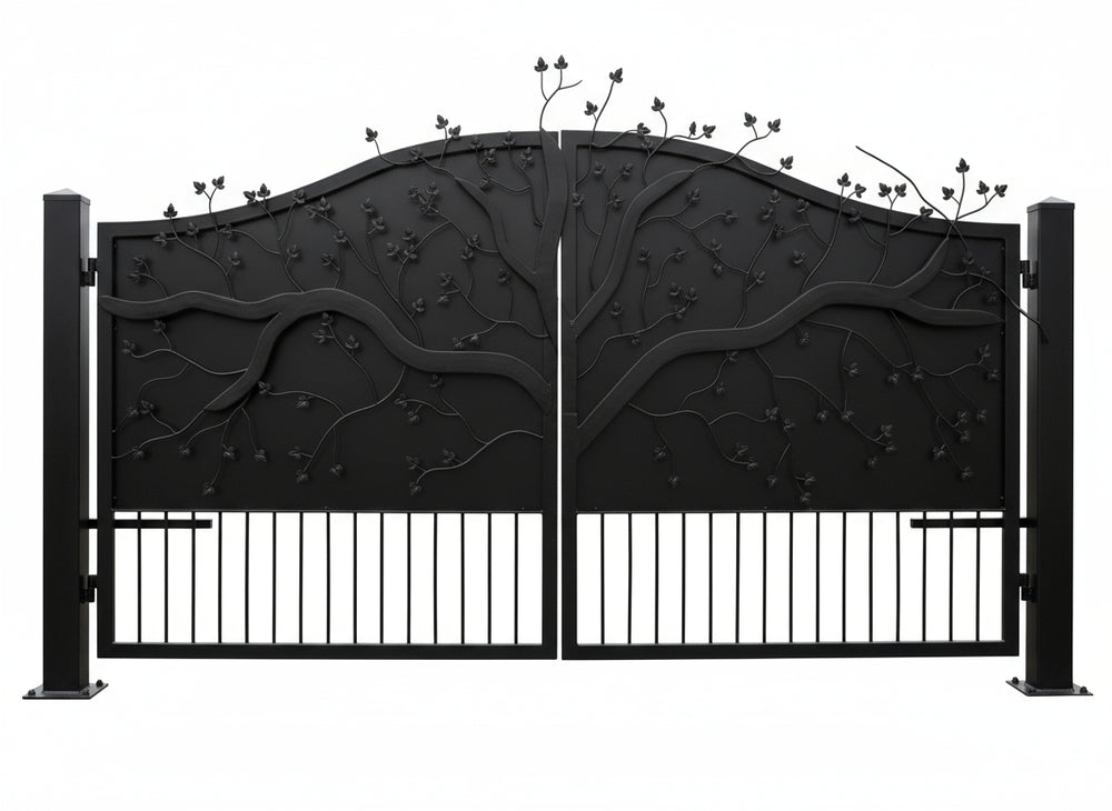 tree silhouette driveway gate, nature-inspired wrought iron gate, custom steel entrance gate, Canadian artistic gate, garden estate gate, heavy-duty decorative gate, Taimco driveway gate, outdoor sculptural gate, stylized tree gate design