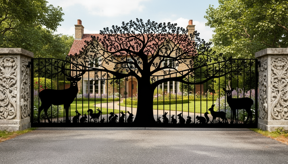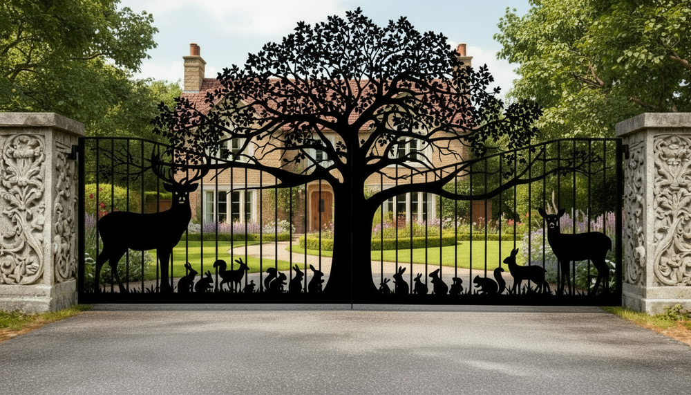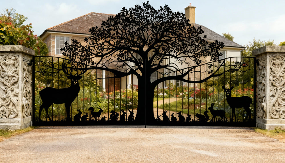 Welcome guests with the serenity of nature through our Nature-Inspired Wrought Iron Driveway Gate, featuring a stunning Tree of Life centrepiece surrounded by silhouettes of deer, rabbits, and birds. Handcrafted from solid steel and finished in a weather-resistant black powder coat, this gate blends artistic beauty with rugged durability. Perfect for forested properties, country homes, or nature retreats, it creates a peaceful and secure entrance that reflects your love for the outdoors.