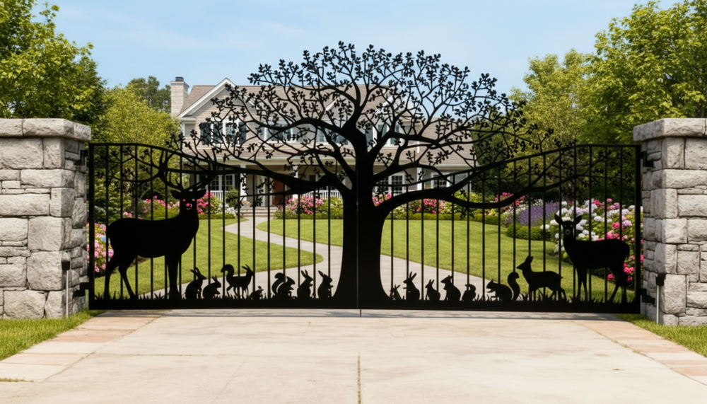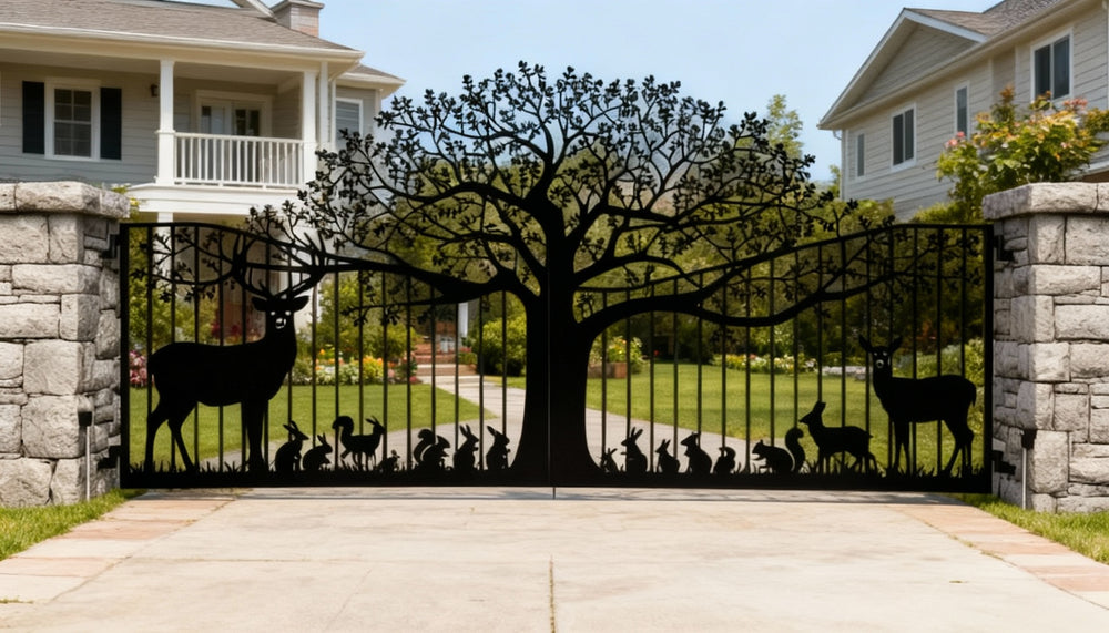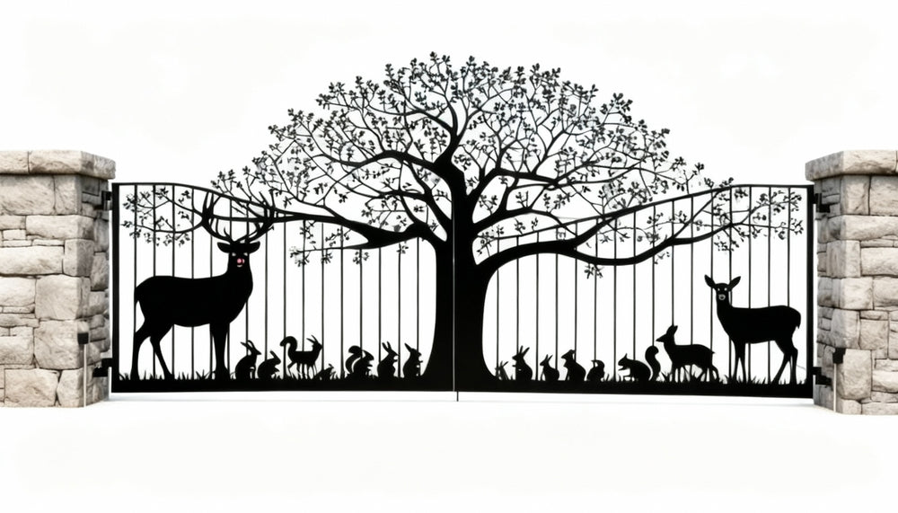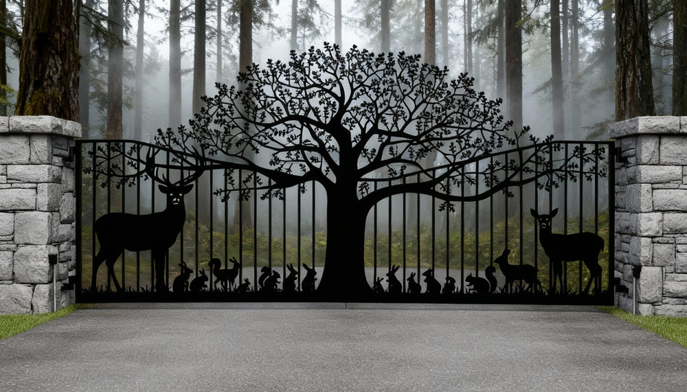 Let your entrance echo the soul of the forest. Whispering Grove features a sculptural tree centerpiece with sprawling branches, surrounded by silhouettes of deer, rabbits, and woodland creatures. Framed by rugged stone pillars and set against a misty forest backdrop, this gate transforms your threshold into a living story—perfect for nature sanctuaries, mountain estates, or homes that honor tranquility and wildlife.