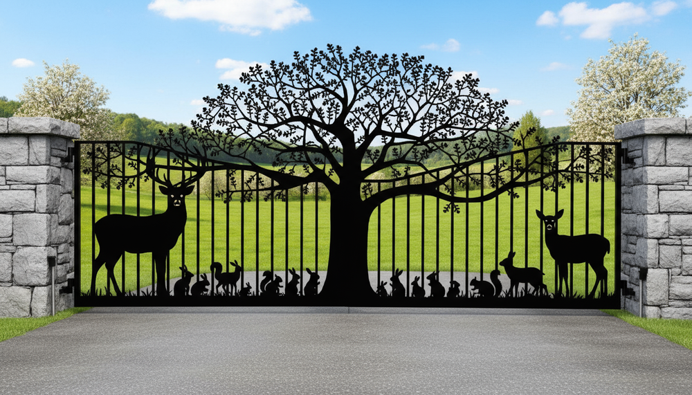 woodland silhouette driveway gate, forest-themed wrought iron gate, custom steel entrance gate, Canadian artistic gate, deer and tree gate design, Taimco driveway gate, heavy-duty decorative gate, nature-inspired estate gate