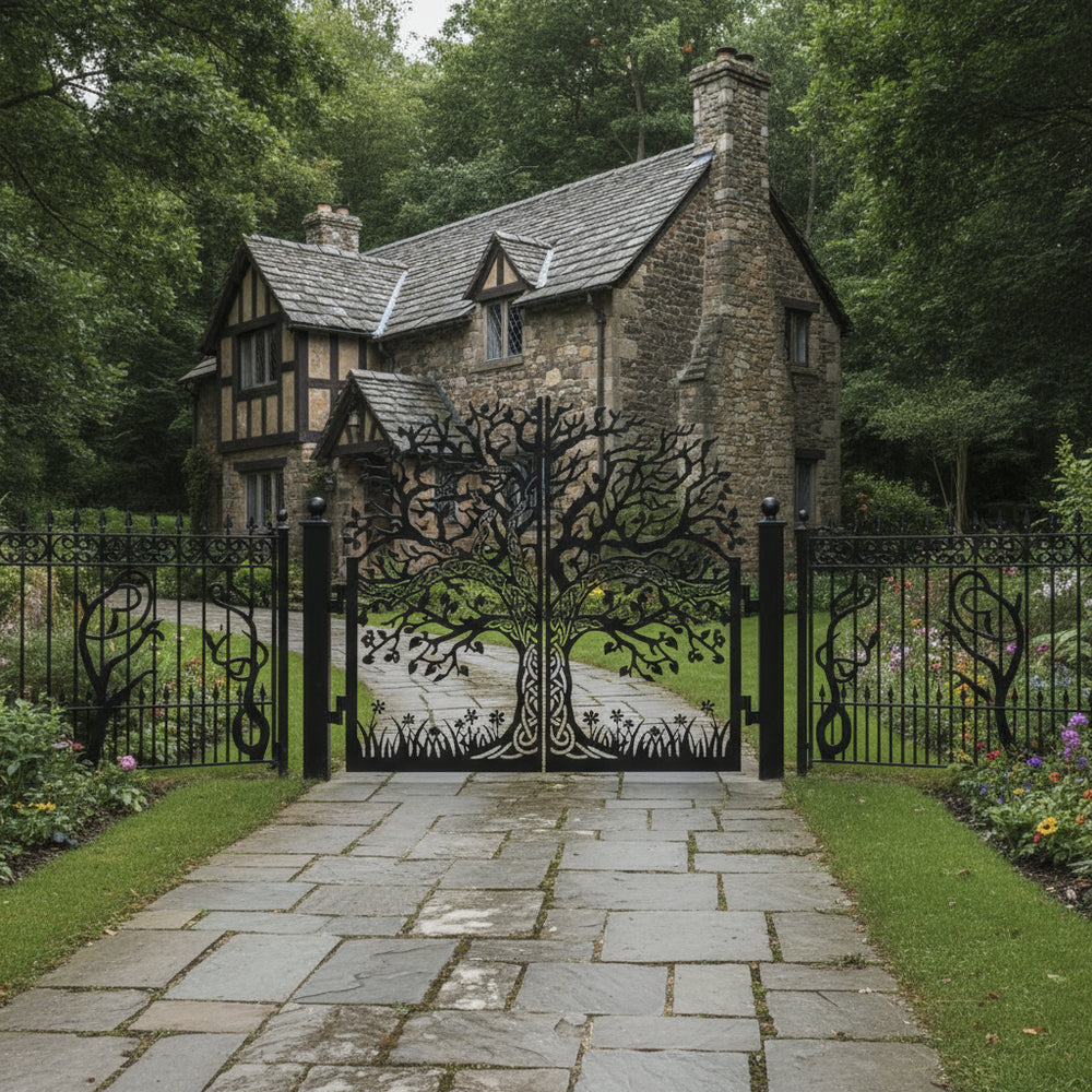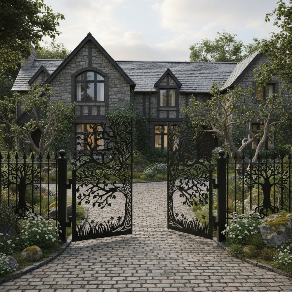 A gate that grows with meaning. Tree of Unity features dual swing panels forming a mirrored tree whose trunk is interwoven with Celtic knots and whose branches stretch into a stylized canopy of leaves. The base is grounded with floral silhouettes and grass detailing, while the symmetrical layout and matte black finish evoke strength, serenity, and spiritual resonance. This gate is ideal for nature-inspired architecture, wellness estates, or artistic residences.