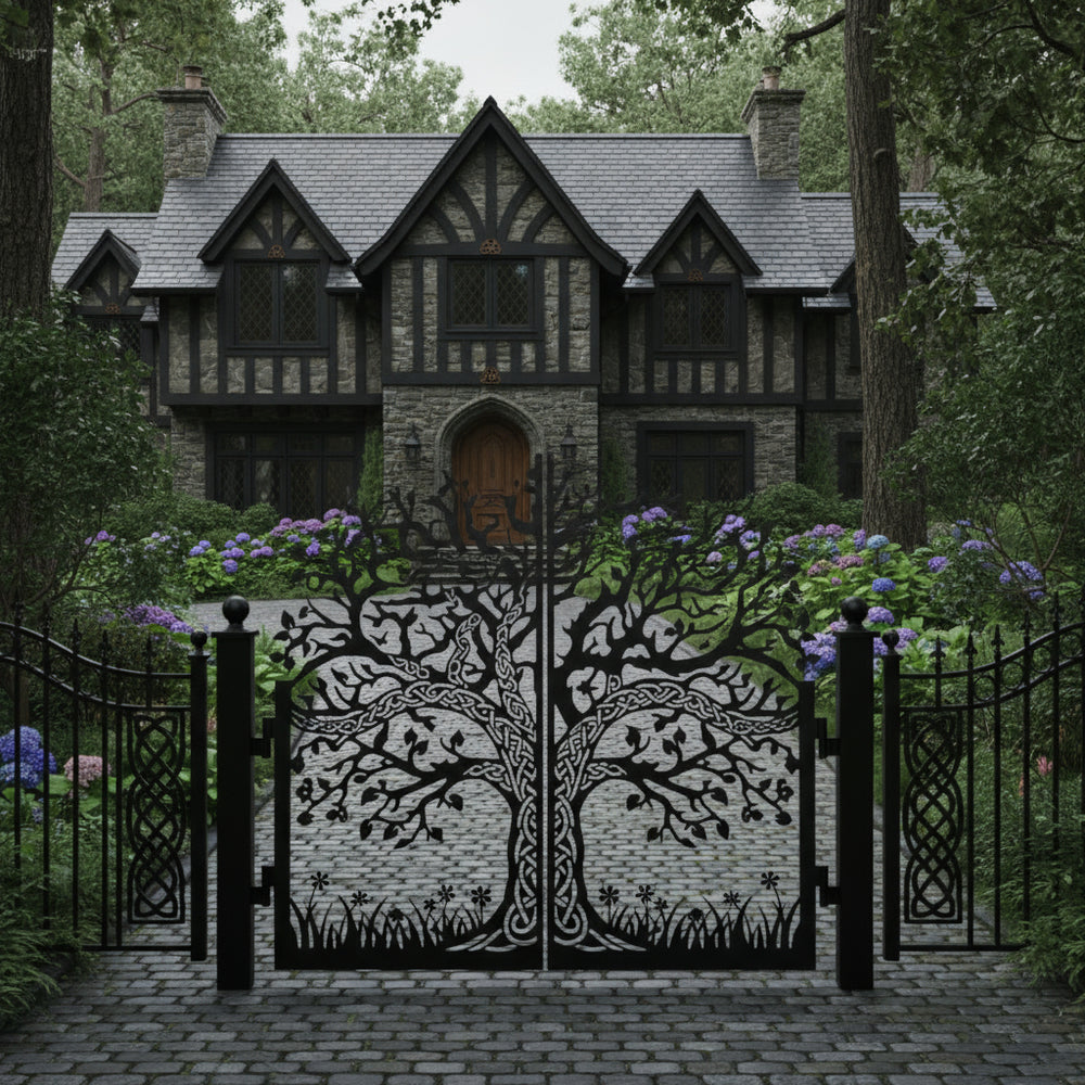 Celtic tree wrought iron gate, tree of life driveway gate, nature-inspired estate gate, Canadian custom gate, Taimco artistic gate, ornamental iron gate, heavy-duty symbolic gate design