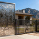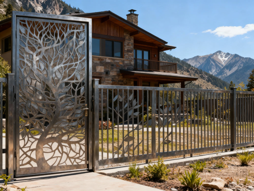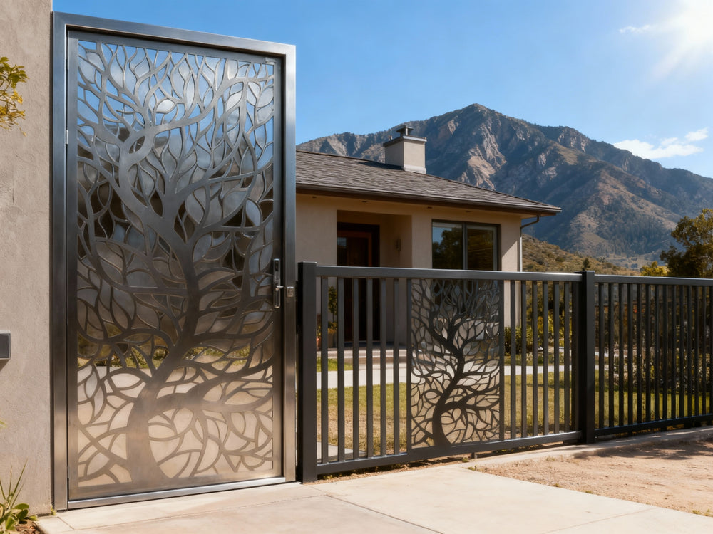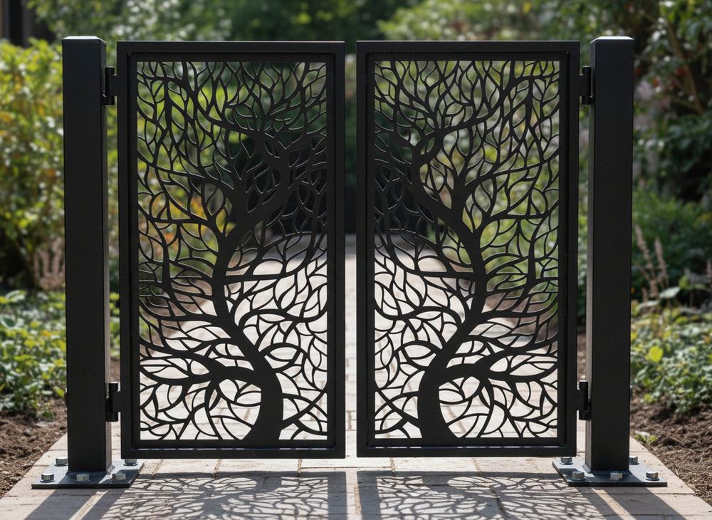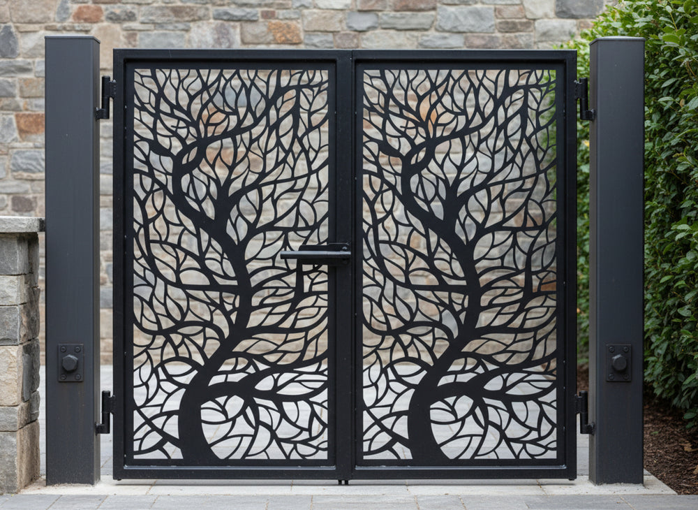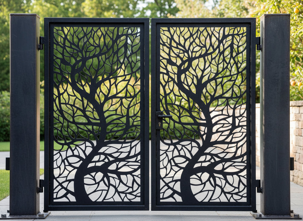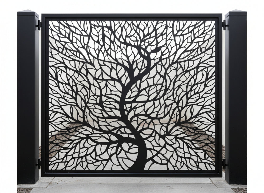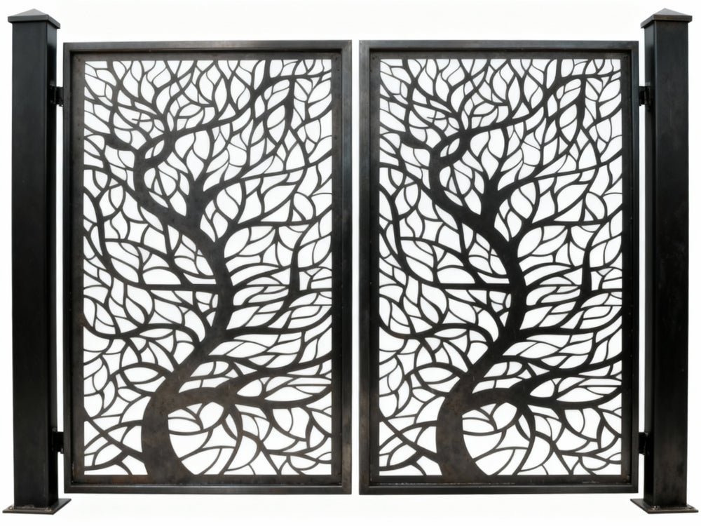 A door that grows with grace. Treeveil Passage features a stylized tree design with flowing trunk and branch silhouettes, crowned by abstract geometric leaves. The composition spreads organically across the panel, offering both visual serenity and architectural presence—ideal for garden entries, landscape transitions, or decorative enclosures that celebrate nature through metal artistry.