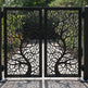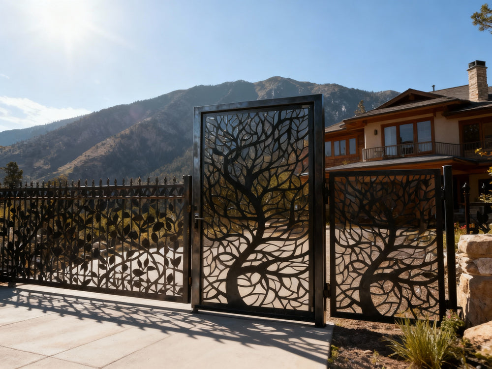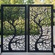 stylized tree man door, abstract leaf metal gate, nature-inspired garden entry, Canadian custom gate, Taimco artistic passage door, manual operation estate gate