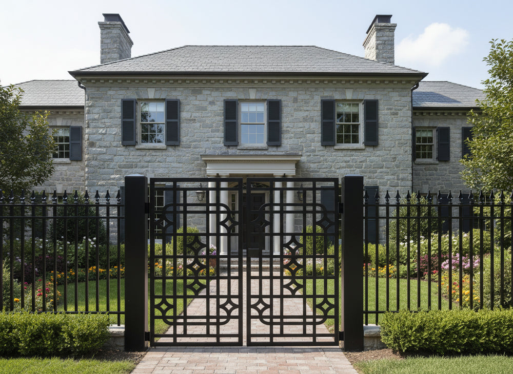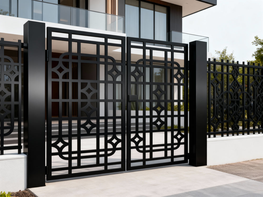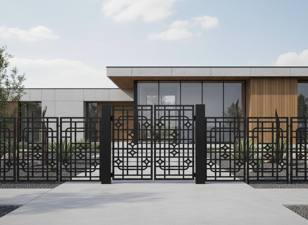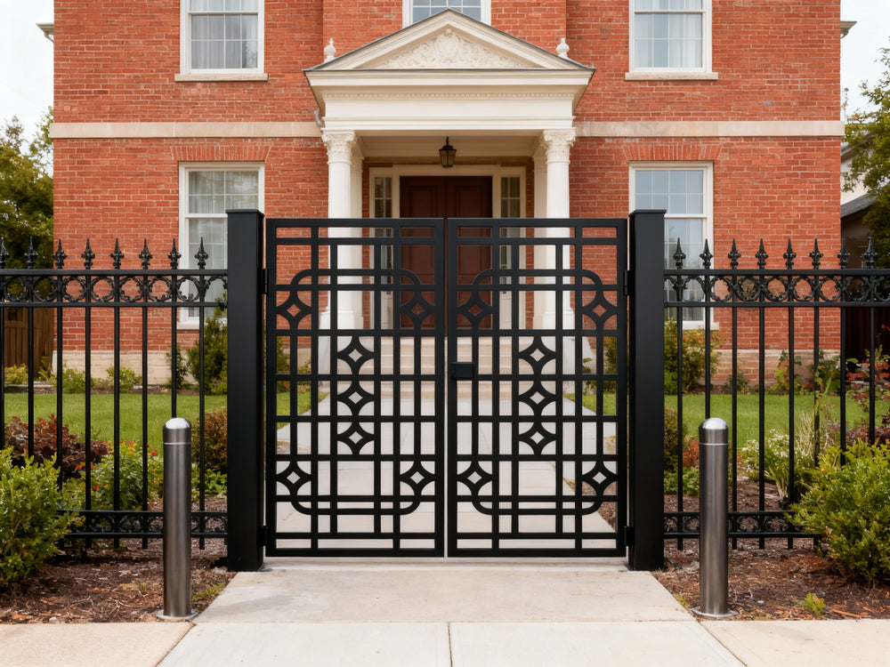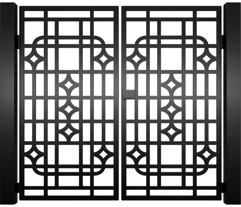 A door that balances edge and elegance. Triadgrid Passage features two symmetrical panels composed of vertical and horizontal bars interspersed with curved elements and diamond-shaped cut-outs. The mirrored layout creates a rhythmic interplay of geometry and ornament—ideal for residential or commercial entries that blend modern structure with decorative flair.
