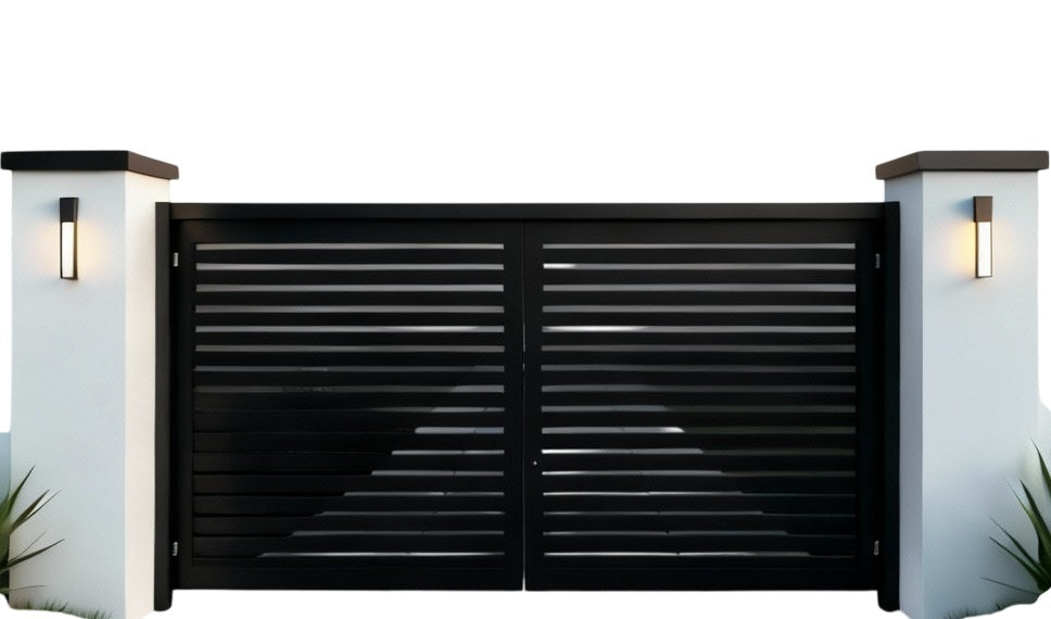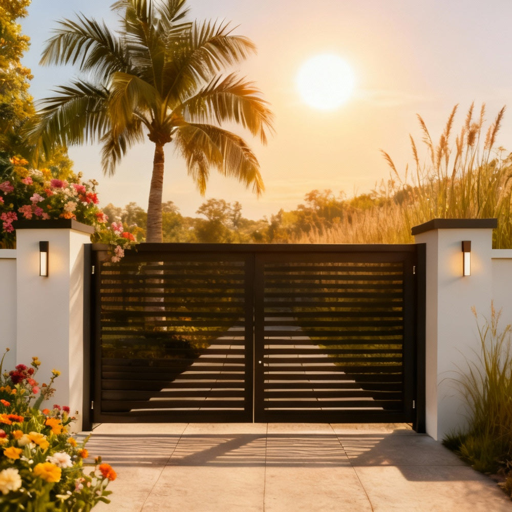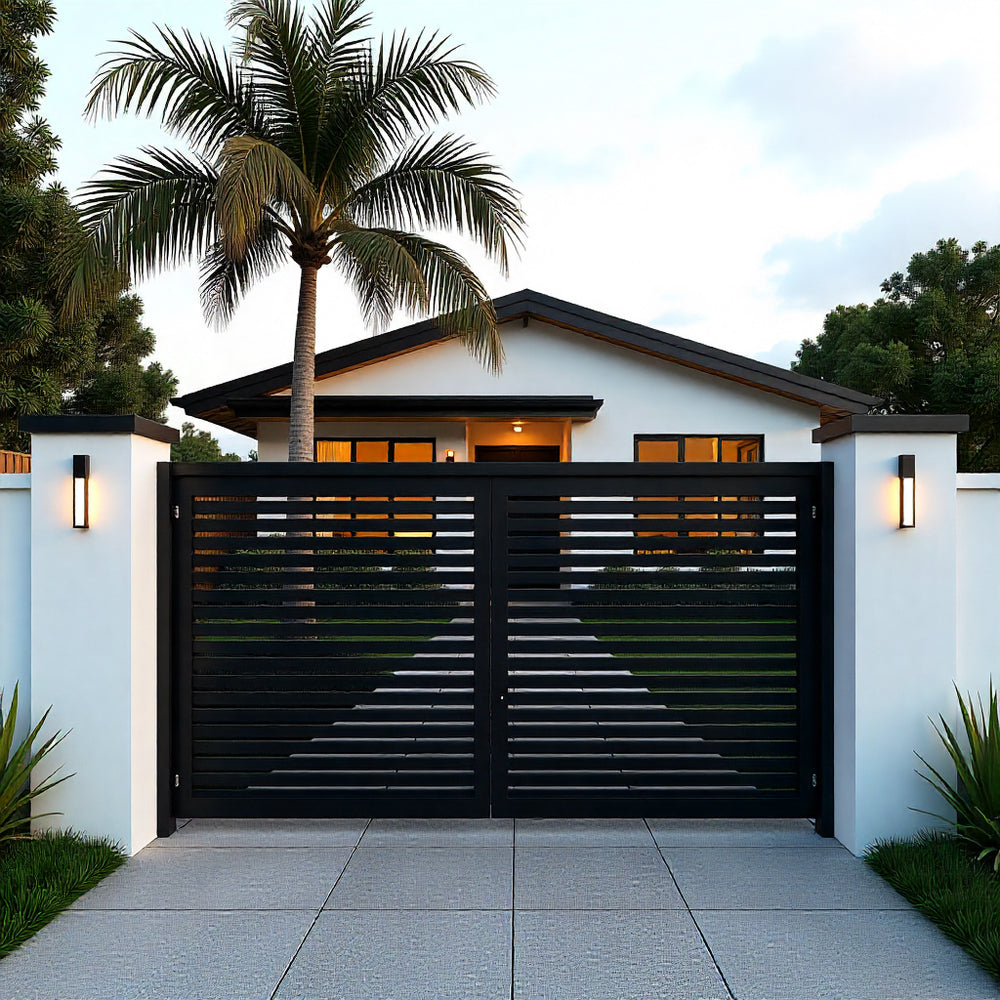 Make a statement of clean sophistication with TriAxis Modern, a laser-cut steel driveway gate featuring horizontal slats arranged in a dynamic triangular formation. Designed for modern architecture, tropical landscapes, and minimalist aesthetics, this gate offers privacy, symmetry, and visual rhythm—perfect for high-end residences, boutique villas, or design-forward estates.
