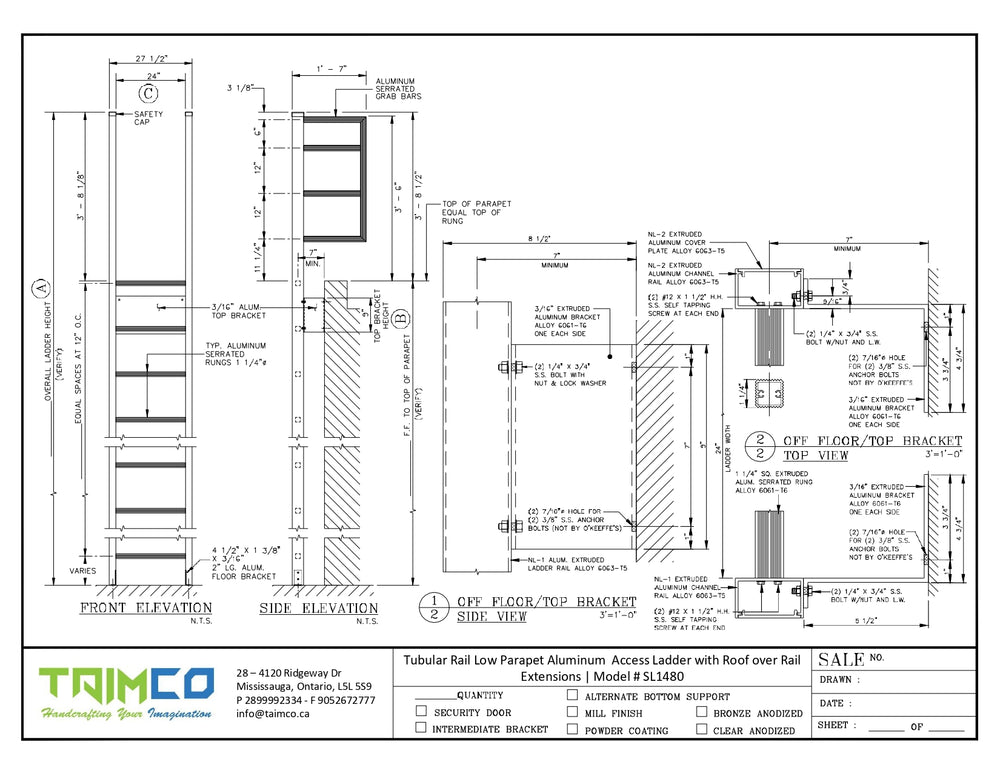 Tubular Rail Low Parapet Aluminum Access Ladder with Roof over Rail Extensions | Model # SL1480
