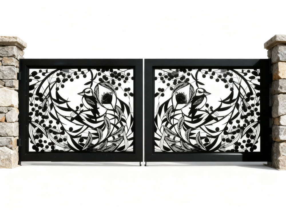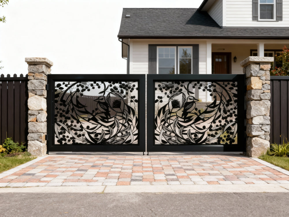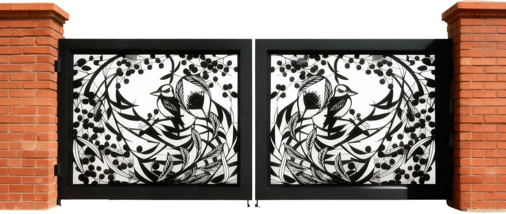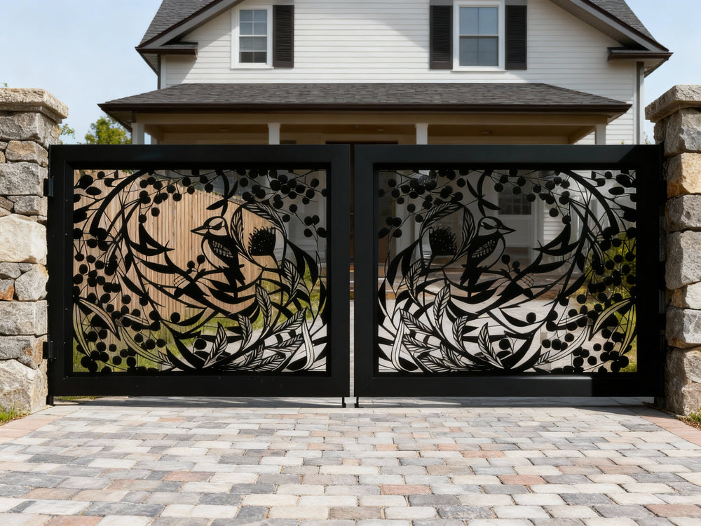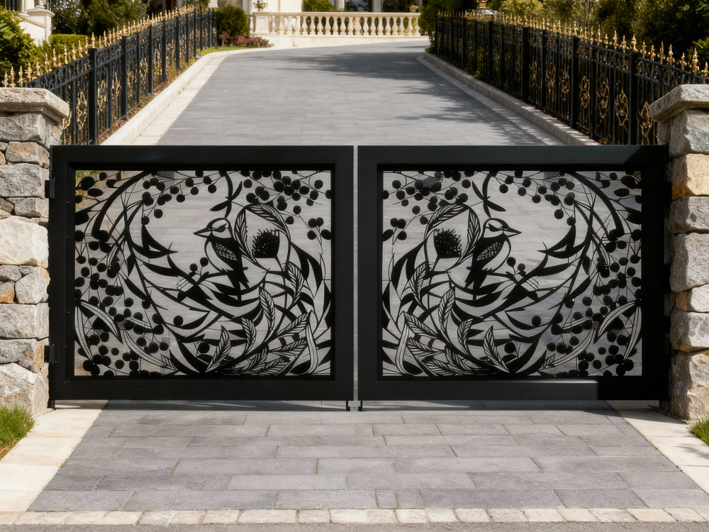 Let your entrance speak in silhouettes. The Twilight Whispers driveway gate features a poetic plasma-cut design of birds in flight, swirling vines, and a tranquil landscape that evokes the magic of dusk. With its layered composition and artistic depth, this gate transforms your property into a sanctuary of beauty and calm.