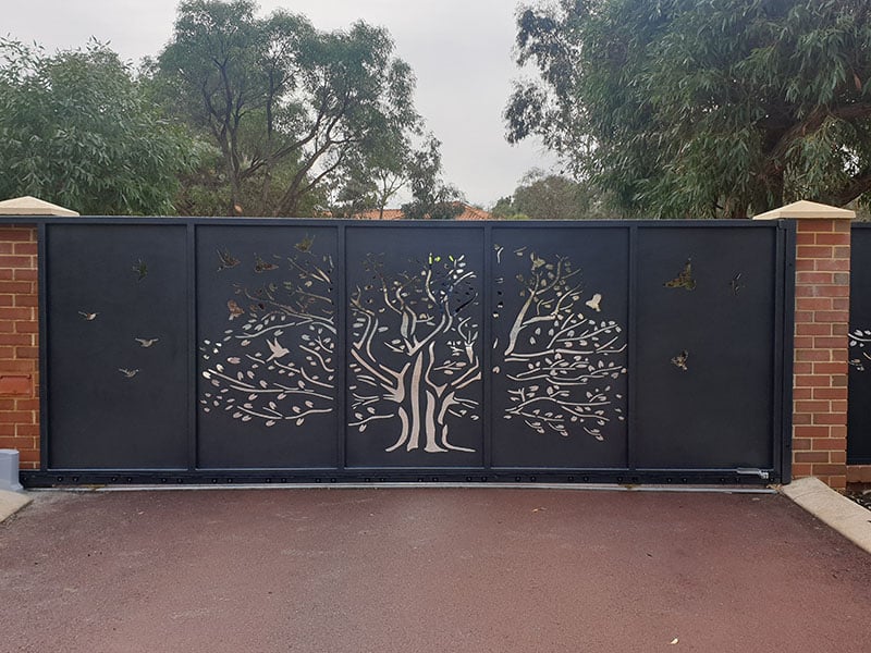 Tree and bird gate, nature-inspired driveway gate, plasma-cut steel gate, custom metal gate, DWG869 gate, Taimco gates, artistic entrance gate, Canadian-made gate, single panel gate, sliding gate, single swing gate, decorative iron gate