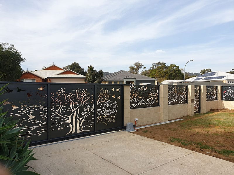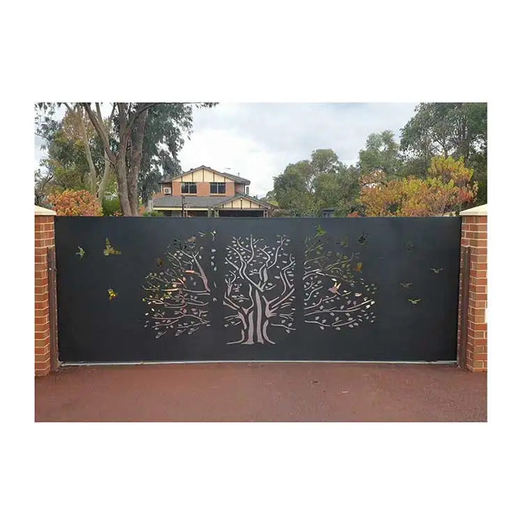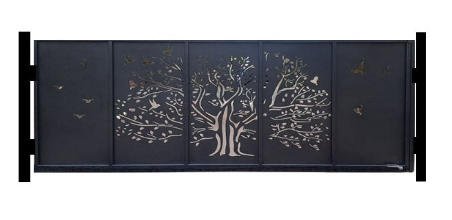 Celebrate the harmony of nature with the Twin Canopy gate—a stunning plasma-cut steel design featuring two symmetrical tree trunks branching outward, adorned with leaves and perched birds. This gate transforms your entrance into a serene and artistic focal point, blending natural beauty with architectural strength.