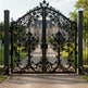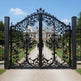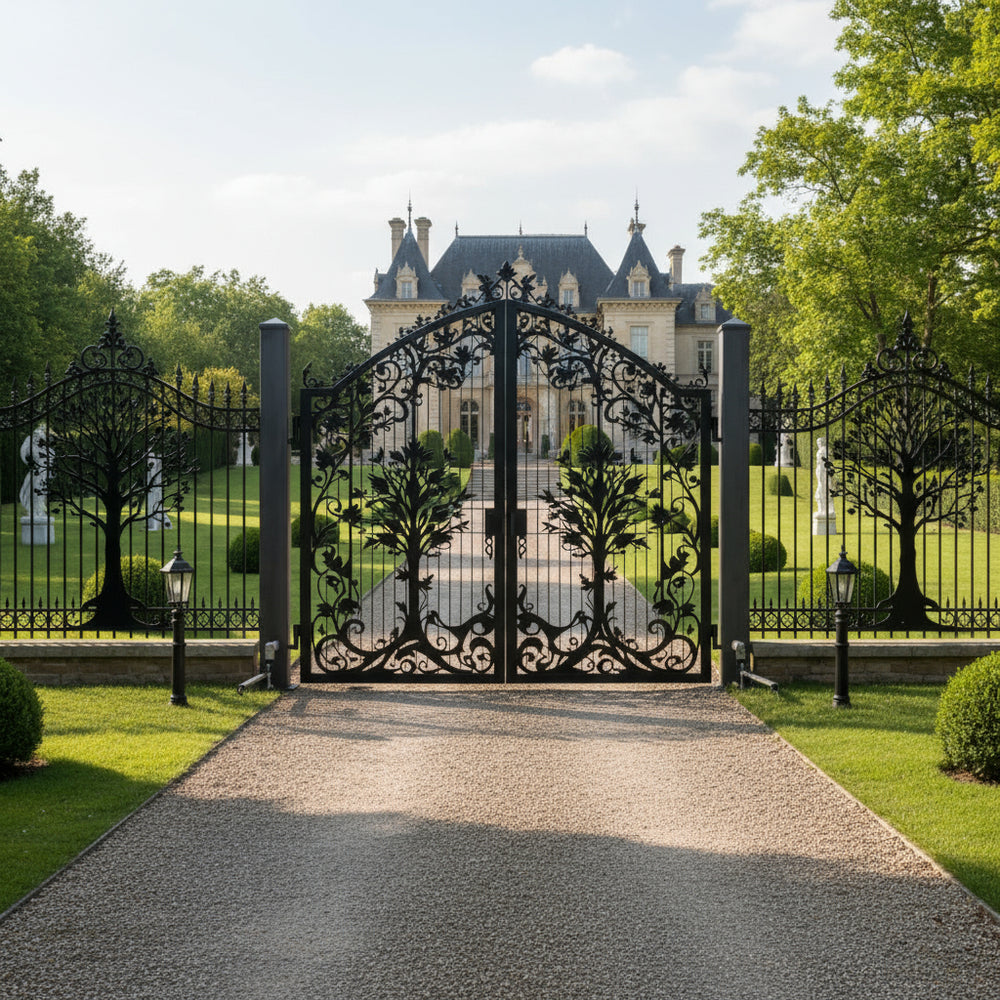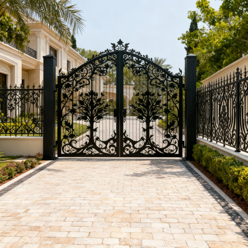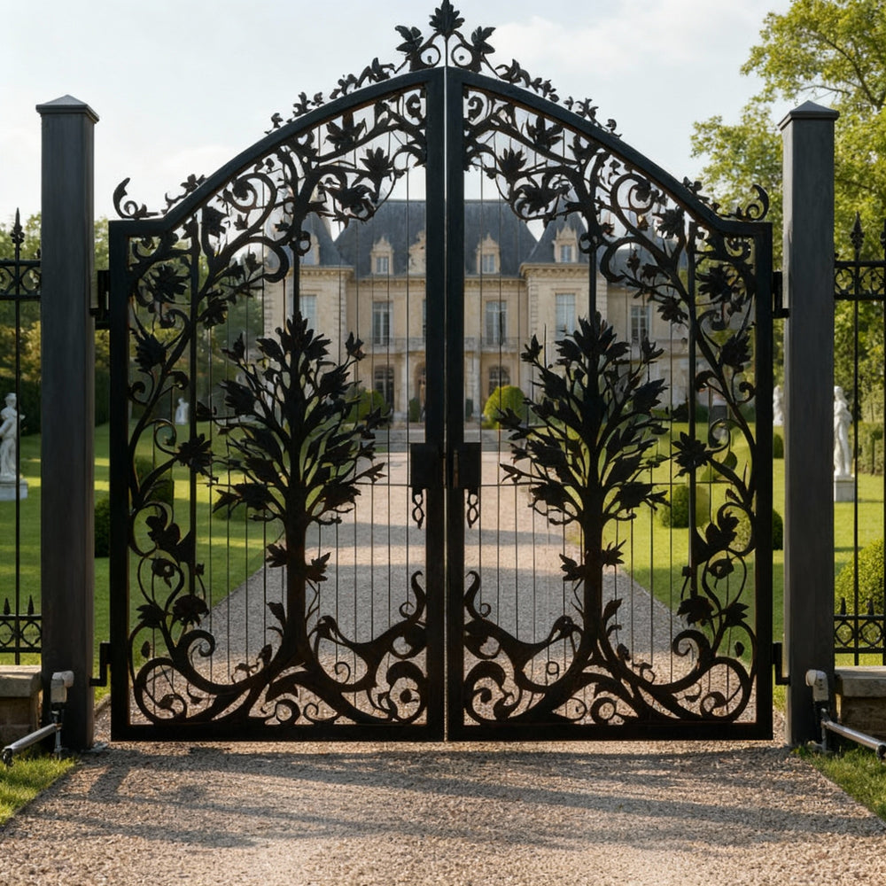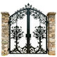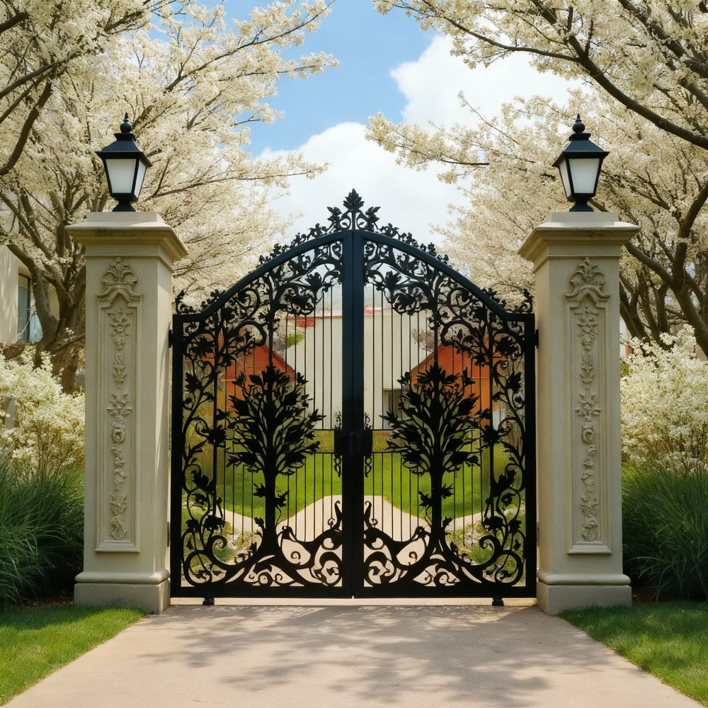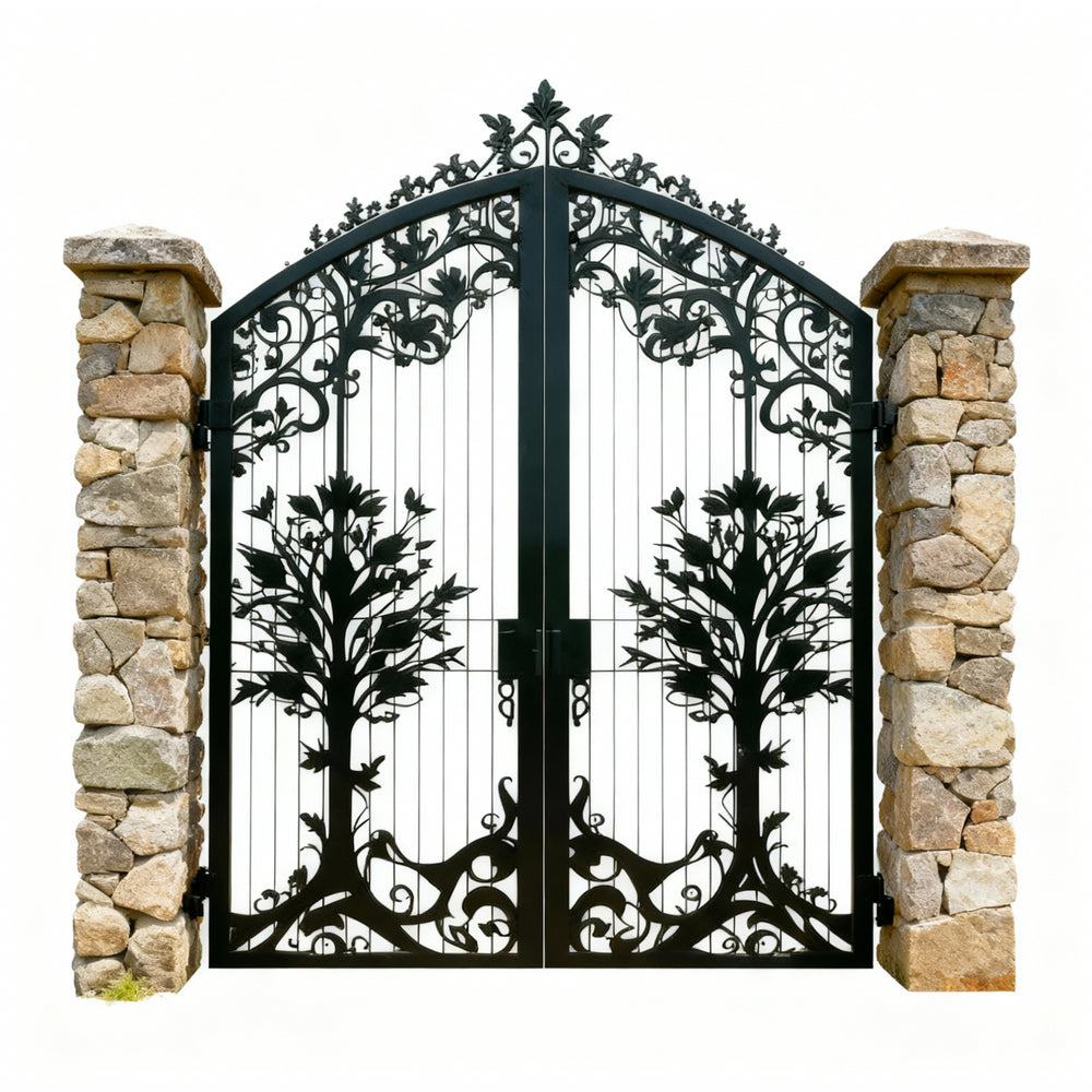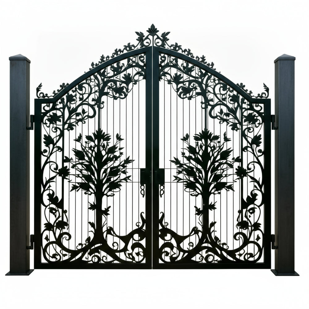 A gate that grows in tandem. Twinroot Harmony features dual swing panels, each adorned with a stylized tree whose branches and leaves stretch upward in mirrored symmetry. The upper arch is crowned with flowing scrollwork and leaf motifs, creating a canopy effect that evokes organic elegance. Framed by bold black pillars, this gate transforms any entrance into a sanctuary of craftsmanship and natural beauty.