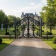 twin tree wrought iron gate, nature-inspired estate gate, leaf scroll driveway gate, Canadian custom gate, Taimco artistic gate, luxury property gate, botanical ornamental gate, heavy-duty sculptural gate design