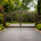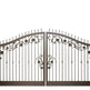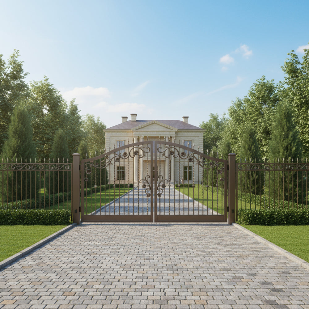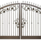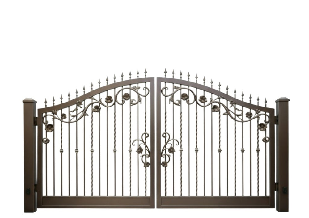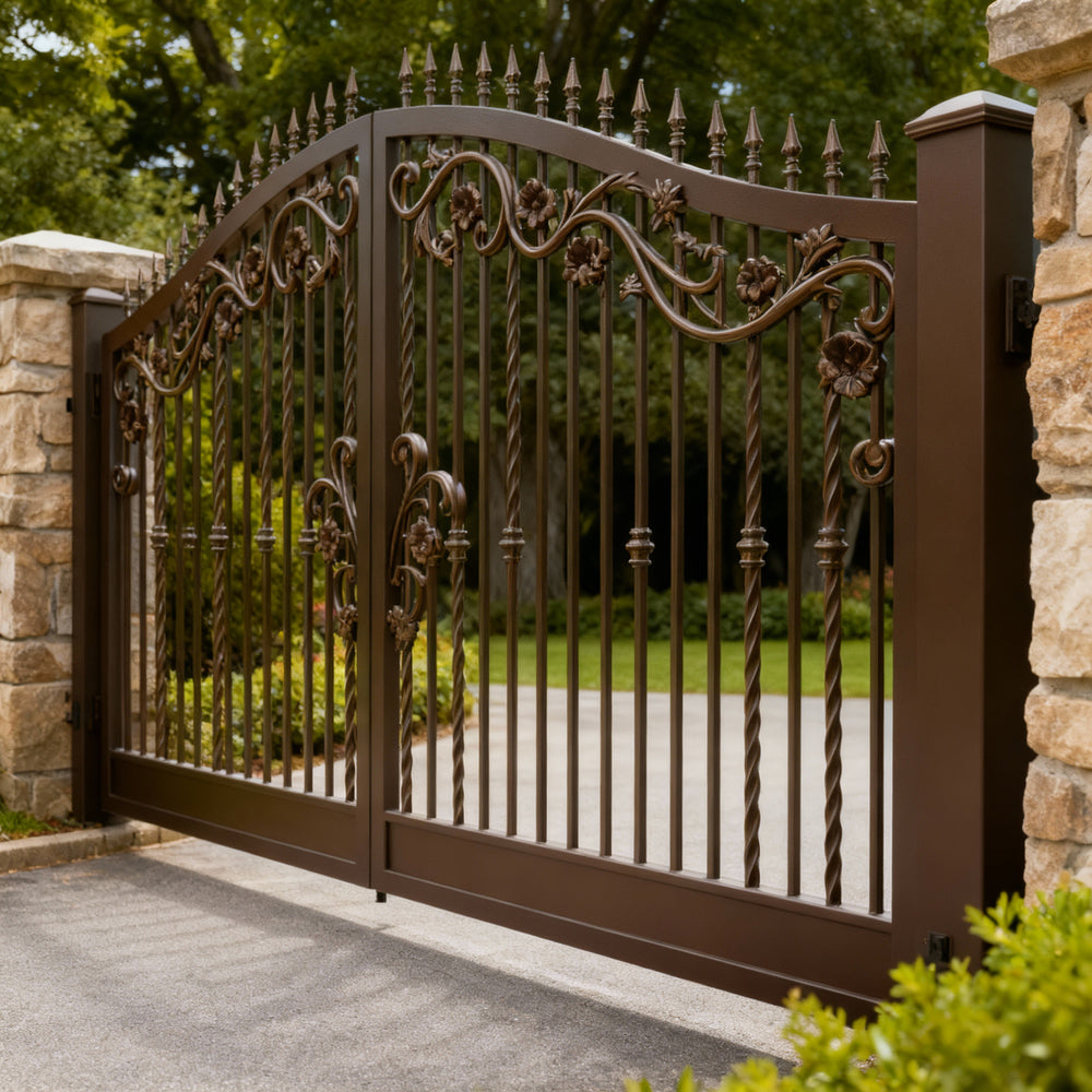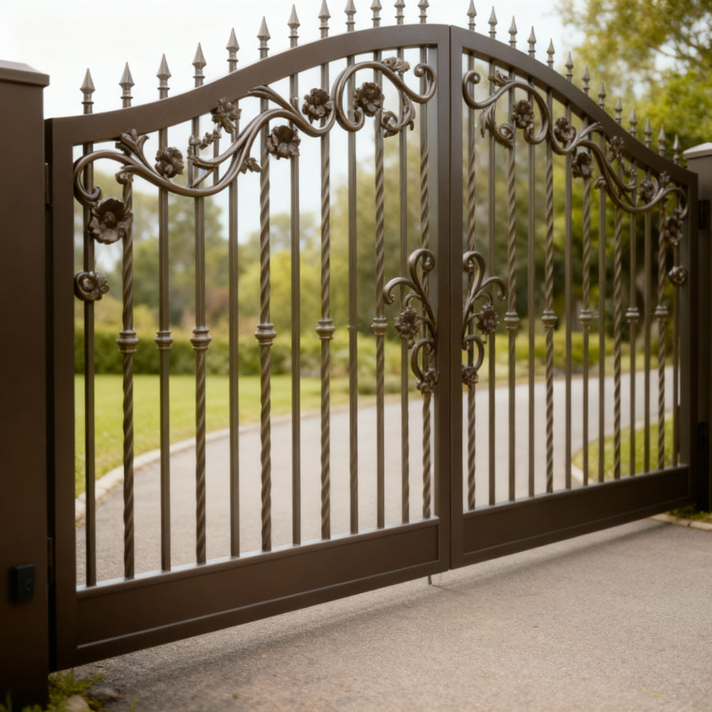 A gate that greets with grace and strength. Twistspire Elegance features dual swing panels with vertical bars—some twisted for visual rhythm—framed by ornamental scrollwork and floral motifs. The arched top is crowned with pointed finials, adding vertical drama and a sense of enclosure. Supported by sturdy posts, this gate evokes heritage, craftsmanship, and timeless refinement.
