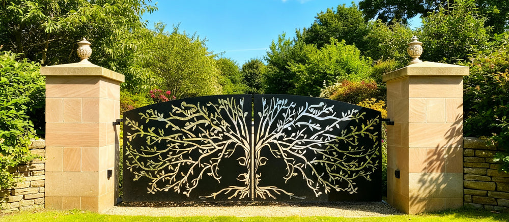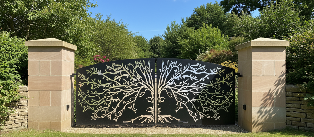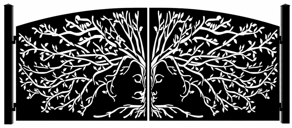 - Design: Tree branches and leaves with sculptural flow across gate and posts