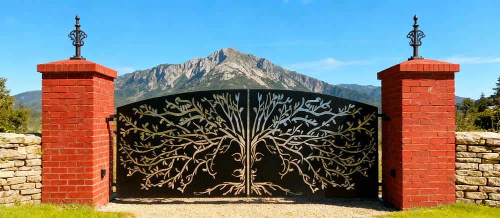 Let nature greet your guests with grace. Branchline Estate features a sculptural tree motif with flowing branches and layered leaves that span both gate panels and extend into the side posts. Designed to echo the surrounding landscape, this gate blends seamlessly with stone architecture, lush gardens, and mountain views—perfect for forested estates, garden villas, or homes celebrating organic beauty.