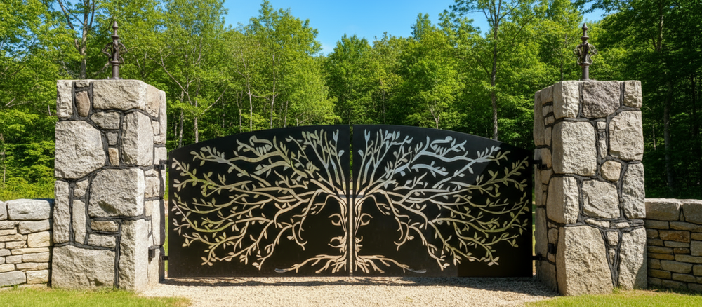 tree silhouette driveway gate, nature-inspired wrought iron gate, custom steel entrance gate, Canadian artistic gate, garden estate gate, mountain home gate, Taimco driveway gate, heavy-duty decorative gate, organic design gate