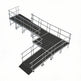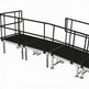 It includes handrails and can be set up on uneven ground. The ramp connects seamlessly to various stage brands