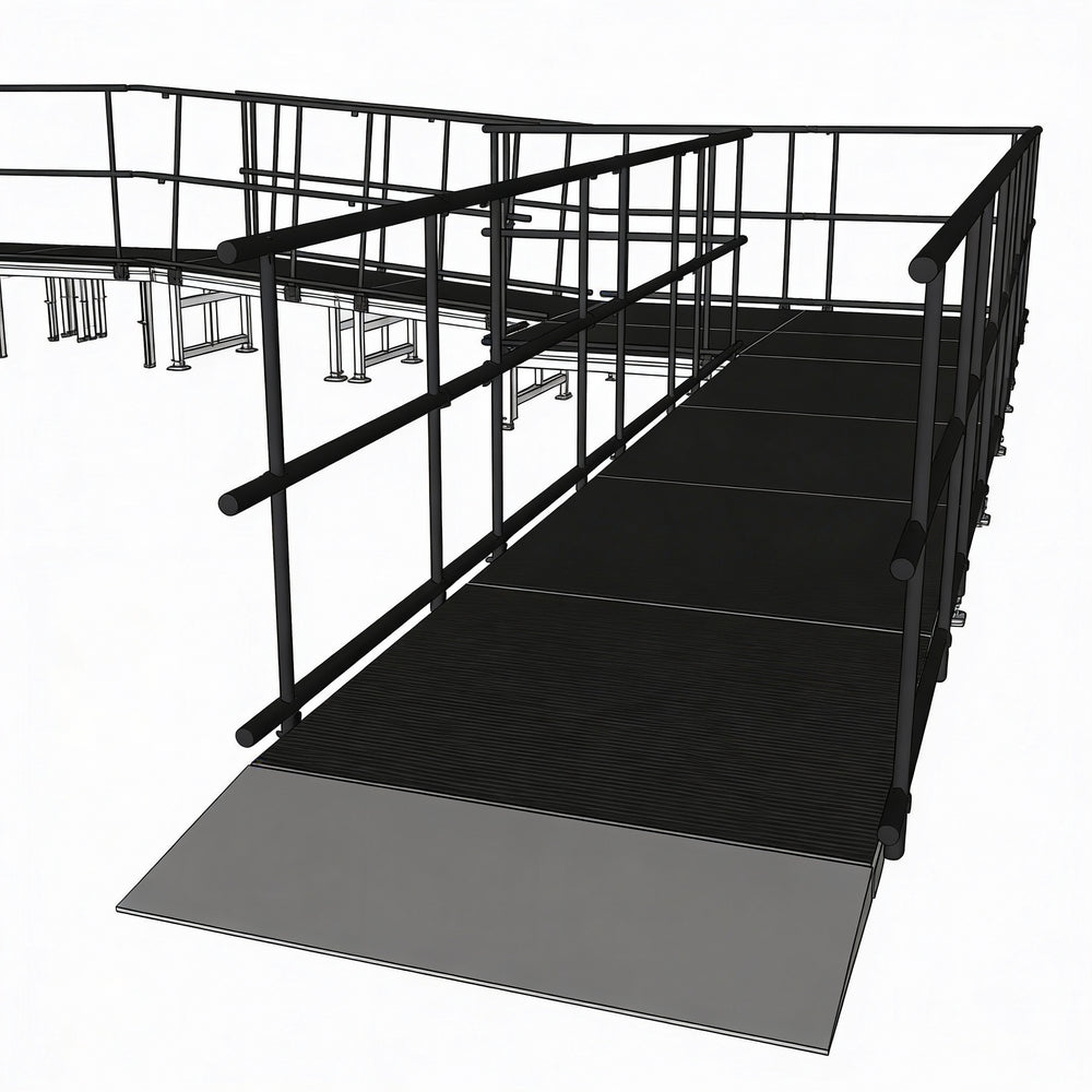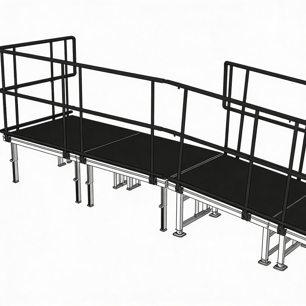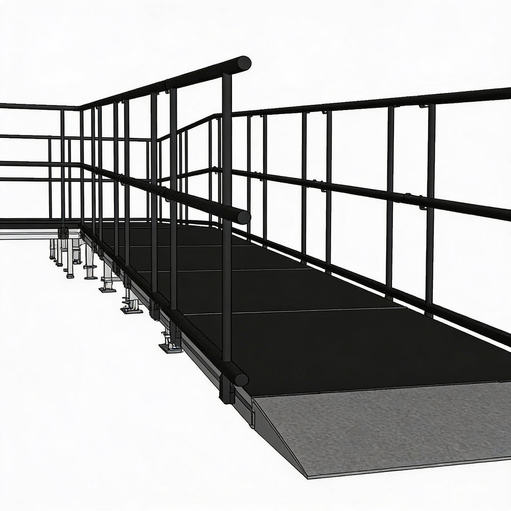 Universal Ramp System, ADA-Compliant Wheelchair Ramp, Modular Ramp Platforms, Industrial Finish Ramps, Aluminum Finish Ramps, Height-Adjustable Ramp Legs, Outdoor Wheelchair Ramp, Temporary Outdoor Ramp, Permanent Outdoor Ramp, Stage Access Ramp, Quick Lock Staging, Interlocking Ramp Frames, Water-Resistant Ramps, Waterproof Ramps, Safety Guardrails, Ramp Configurations, Turn and Switchback Ramps, Event Venue Ramp, Commercial Property Ramp, Residential Community Ramp
