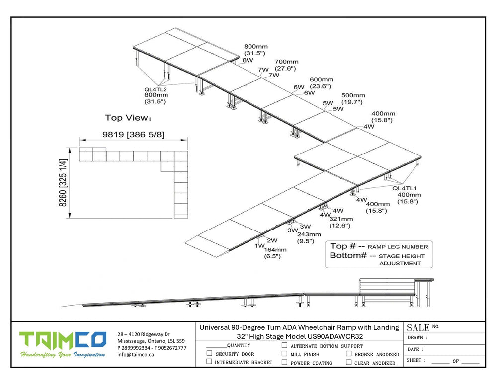 Universal 90-Degree Turn ADA Wheelchair Ramp with Landing 32" High Stage Model US90ADAWCR32
