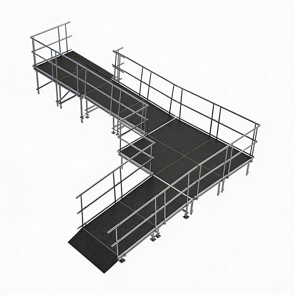 Universal Ramp System, ADA-Compliant Wheelchair Ramp, Modular Ramp Platforms, Industrial Finish Ramps, Aluminum Finish Ramps, Height-Adjustable Ramp Legs, Outdoor Wheelchair Ramp, Temporary Outdoor Ramp, Permanent Outdoor Ramp, Stage Access Ramp, Quick Lock Staging, Interlocking Ramp Frames, Water-Resistant Ramps, Waterproof Ramps, Safety Guardrails, Ramp Configurations, Turn and Switchback Ramps, Event Venue Ramp, Commercial Property Ramp, Residential Community Ramp