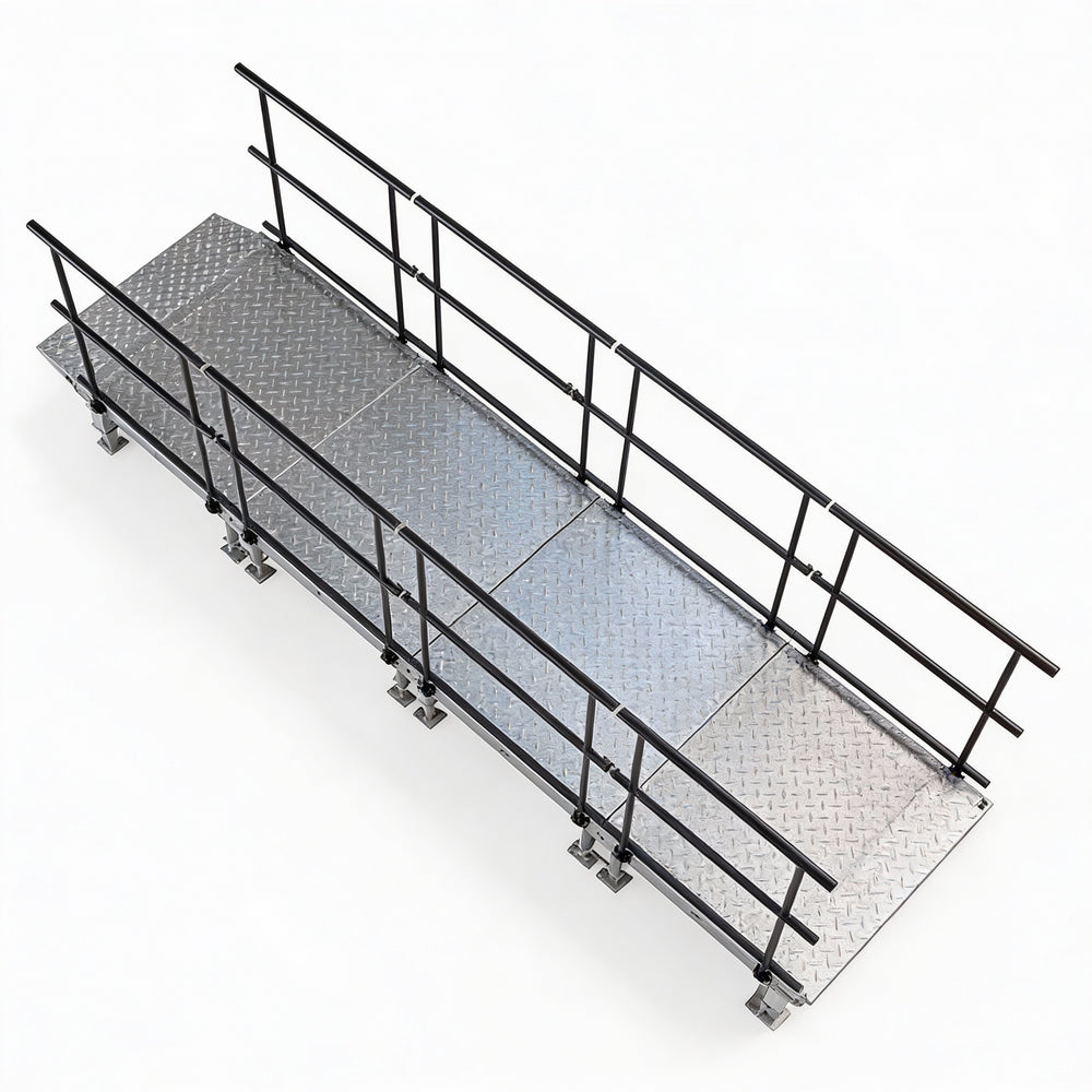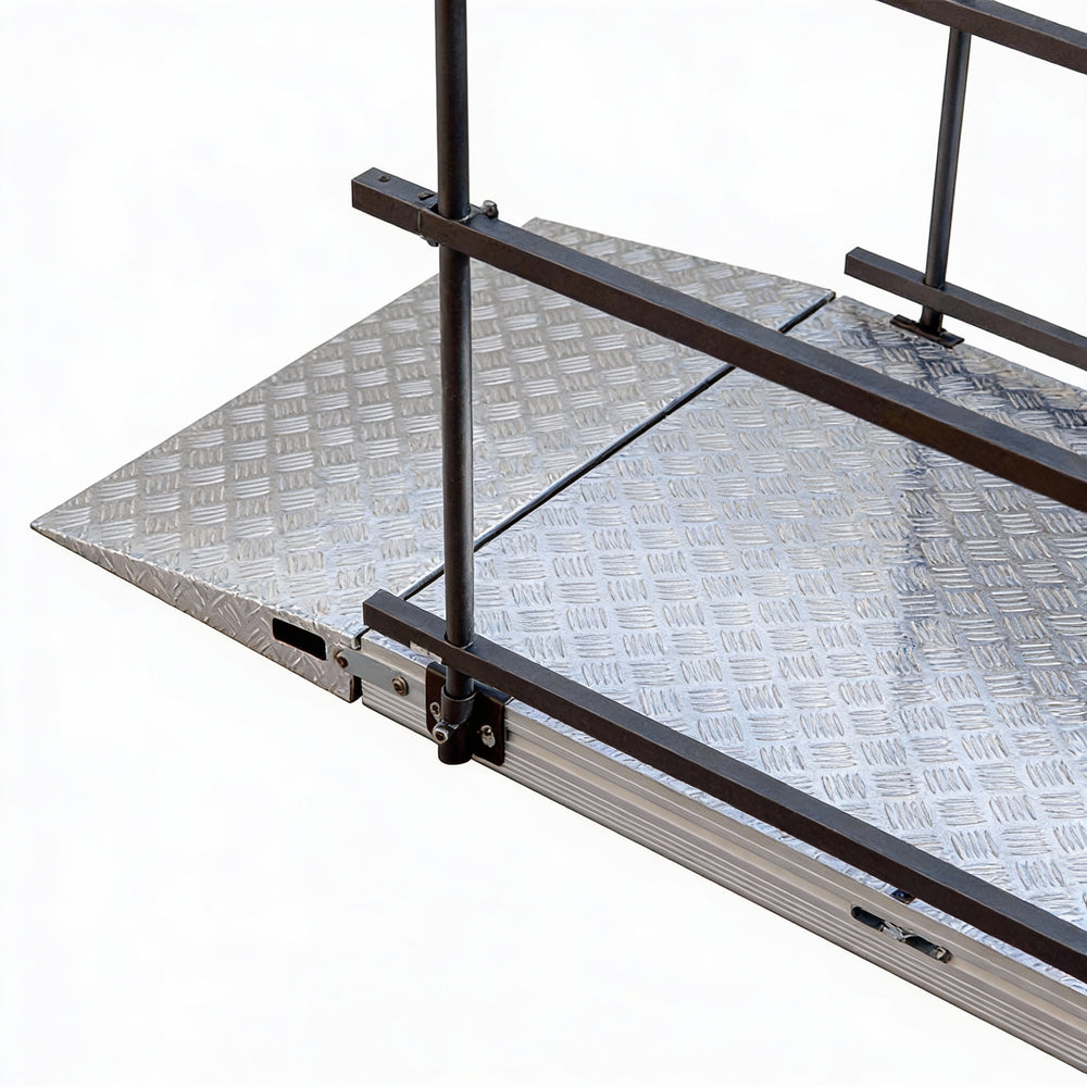 - The height-adjustable legs maintain a consistent 12:1 slope, and the included guardrails enhance safety.