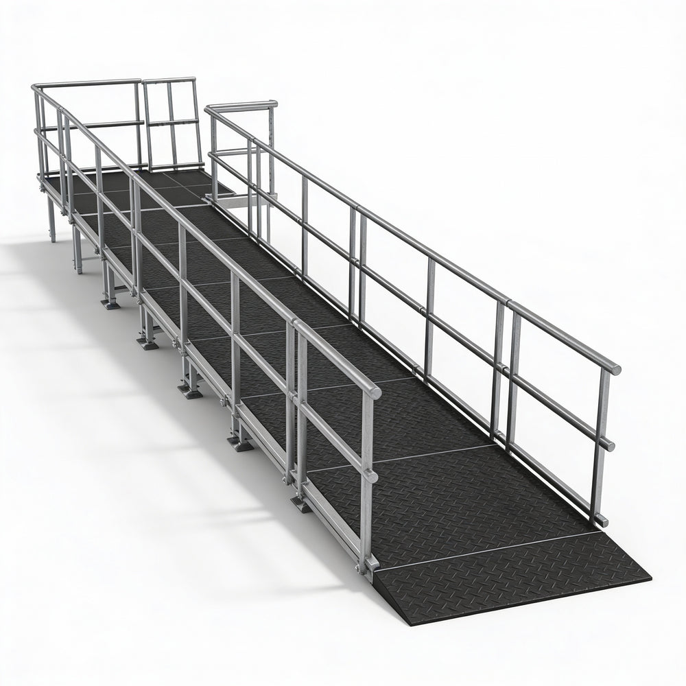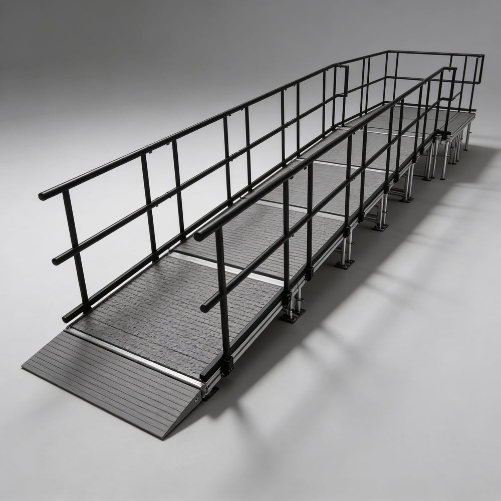 - The height-adjustable legs maintain a consistent 12:1 slope, and the included guardrails enhance safety.