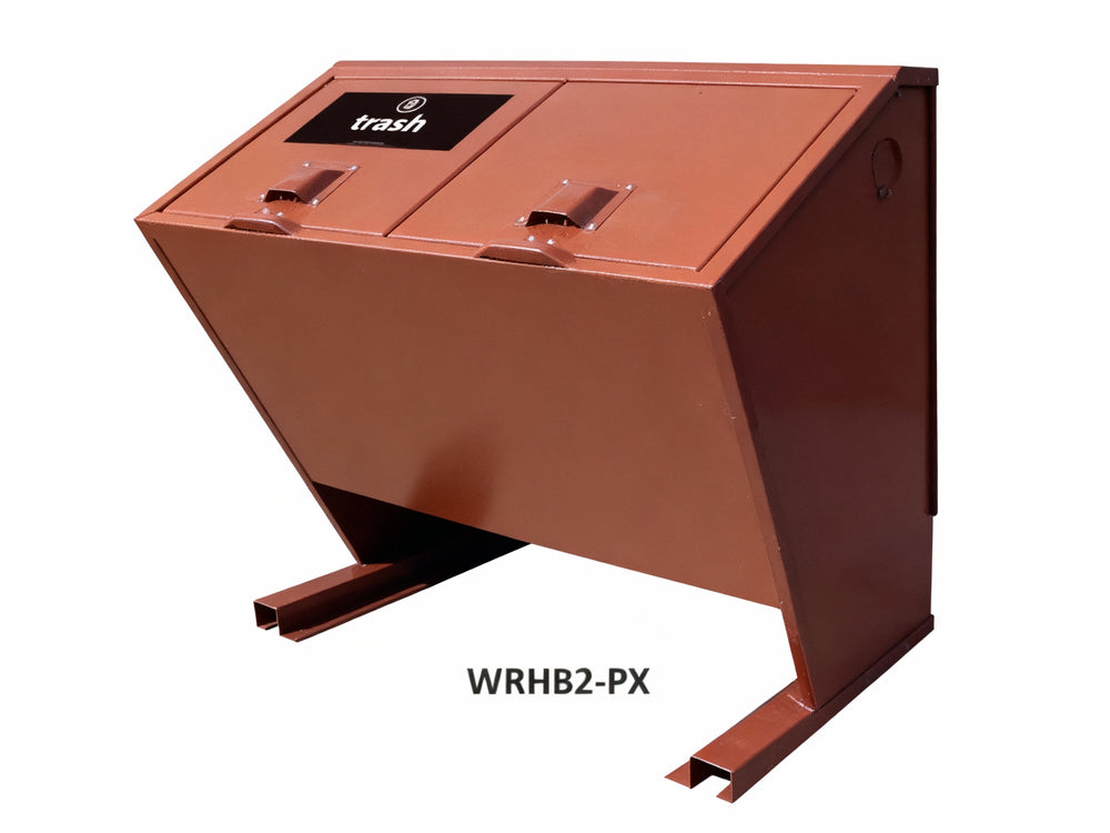 - WRHB2-PX: Double combo trash/recycling enclosure with a recycled plate on the right side and rear-hinged top doors.