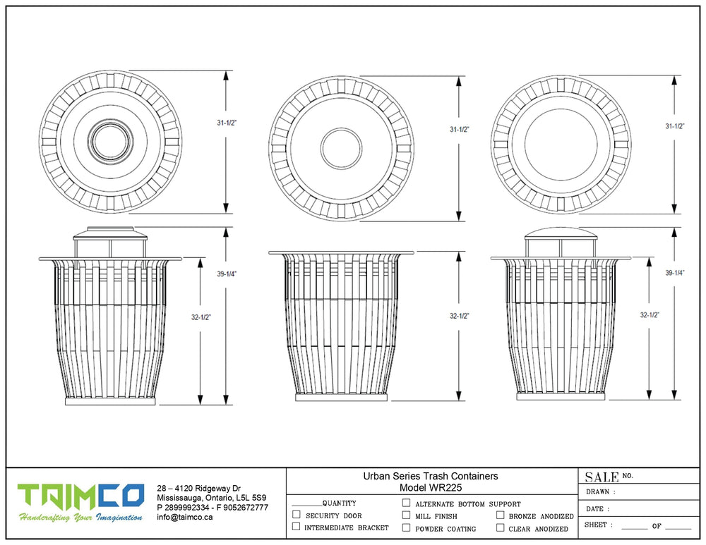 The TAIMCO WR225 combines style and durability, making it the perfect addition to high-traffic indoor and outdoor spaces. Designed to enhance community environments, this premium 36-gallon all-steel trash receptacle maintains cleanliness while complementing its surroundings.