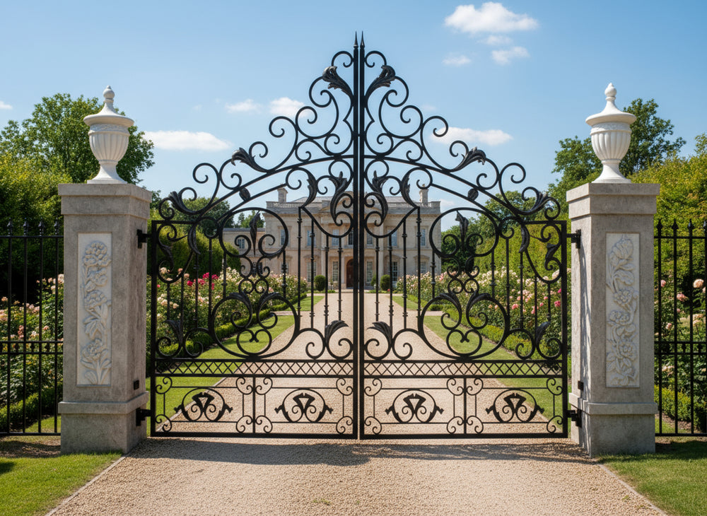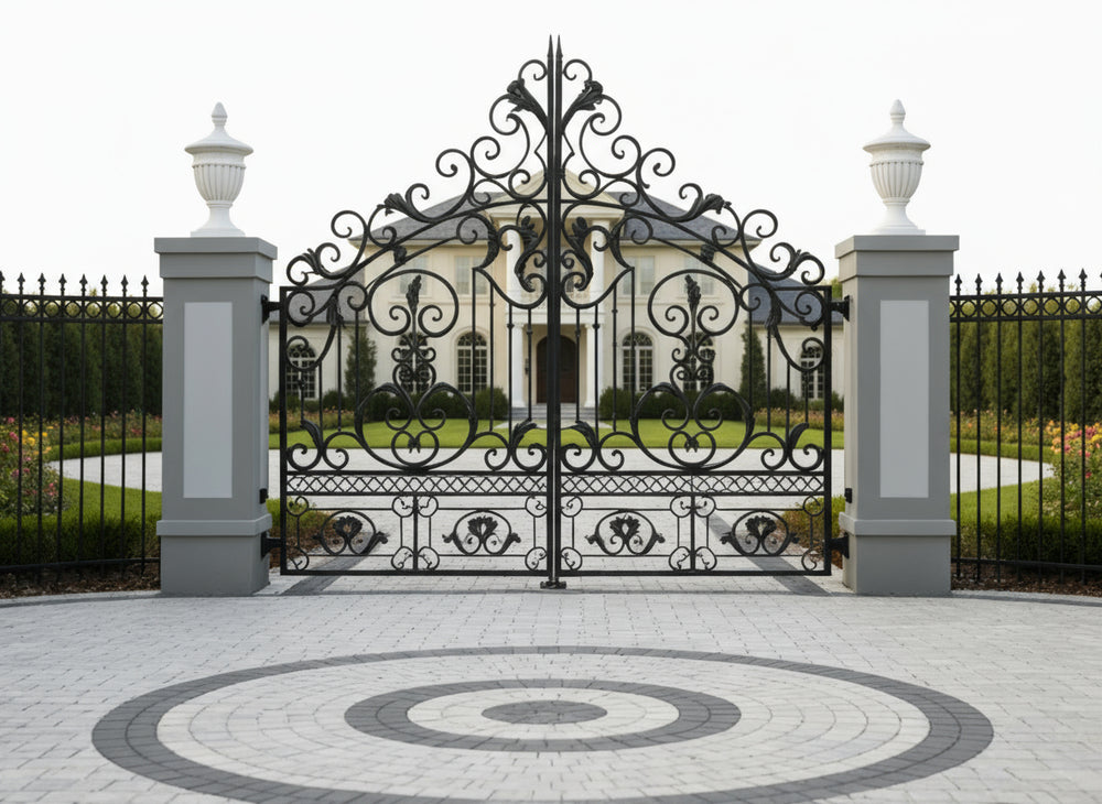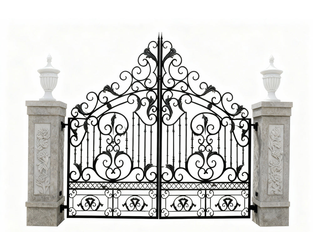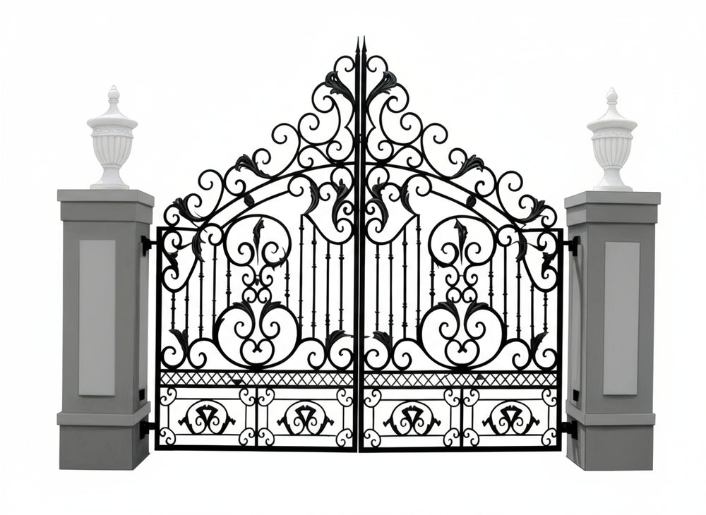 A gate that greets with grace and gravitas. Urncrest Majestique features dual swing panels crowned by a peaked arch, adorned with symmetrical scrollwork, heart-shaped flourishes, and pointed finials. The flanking stone pillars—carved with floral reliefs and topped with classical urns—frame the gate in timeless splendour. This design evokes romance, heritage, and refined craftsmanship.