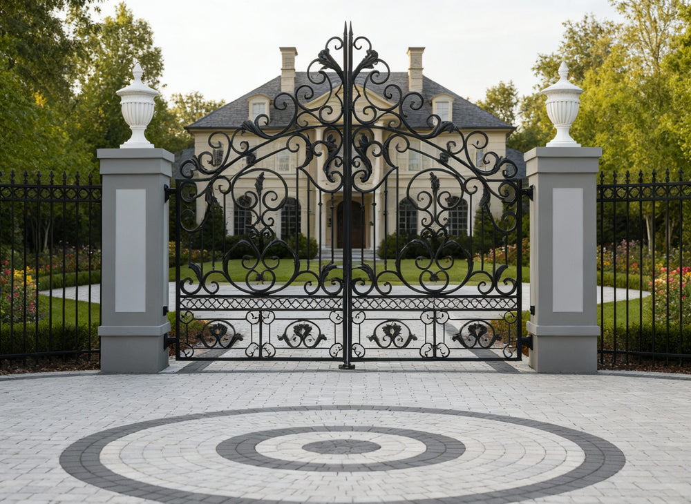 heart scroll wrought iron gate, urn-topped stone pillar gate, fleur-de-lis estate gate, Canadian custom gate, Taimco decorative gate, luxury property gate, romantic ornamental gate, heavy-duty artistic gate design