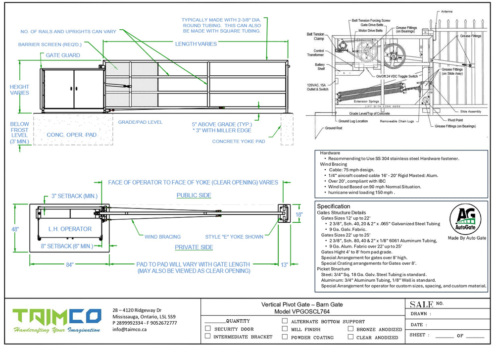 - Durable Factory fabricated by CWB Certified Welders uses Taimco’s proprietary aluminum extrusions to build a gate frame to outlast the competition.