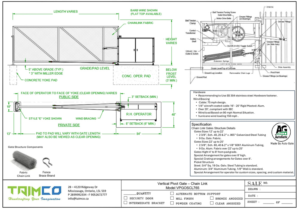 - Durable Factory fabricated by CWB Certified Welders uses Taimco’s proprietary aluminum extrusions to build a gate frame to outlast the competition.