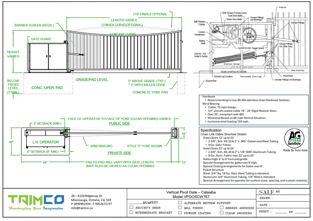 Vertical Pivot Gates, Taimco Vertical Pivot Gates, Efficient security gates, Space-saving gates, Heavy-duty gate motor, Battery backup gates, UL 325-certified gates, Custom infill gate options, Durable aluminum gates, CWB certified welders, Reliable gate systems, Easy gate installation, Perimeter security gates, Industrial security gates, Commercial security gates, Residential security gates, High-security gates, Automatic gate systems, Pivot gate installation, Gate safety features.