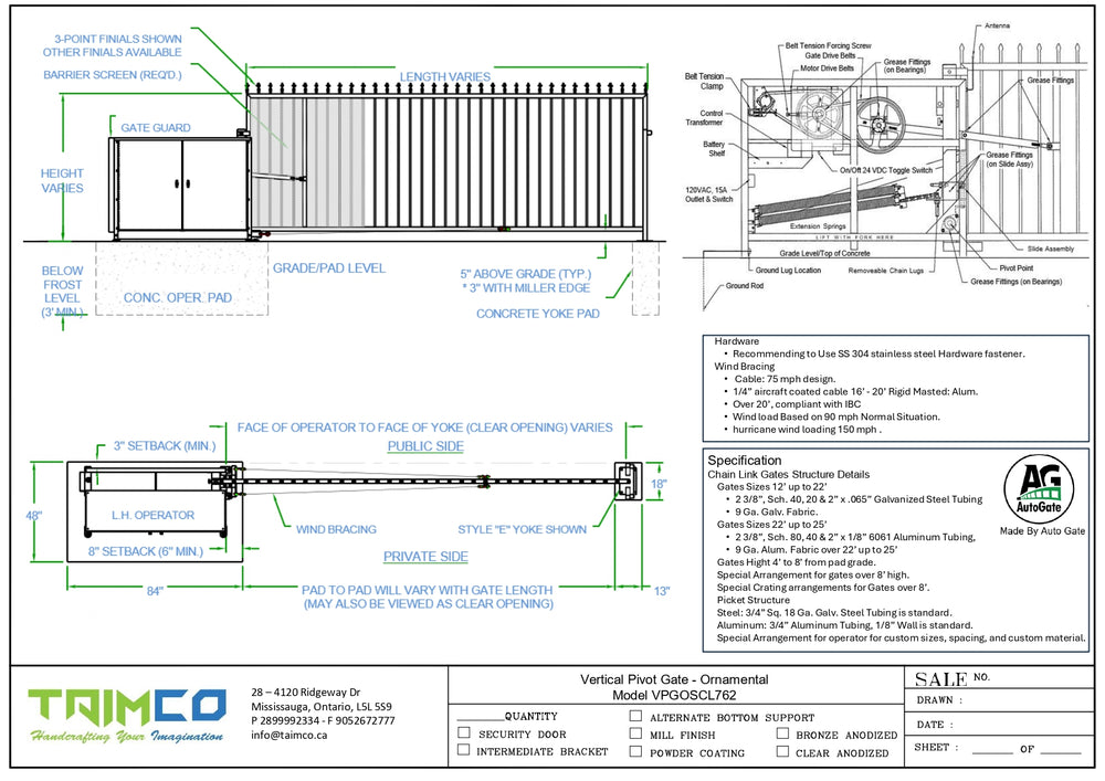 Vertical Pivot Gates, Taimco Vertical Pivot Gates, Efficient security gates, Space-saving gates, Heavy-duty gate motor, Battery backup gates, UL 325-certified gates, Custom infill gate options, Durable aluminum gates, CWB certified welders, Reliable gate systems, Easy gate installation, Perimeter security gates, Industrial security gates, Commercial security gates, Residential security gates, High-security gates, Automatic gate systems, Pivot gate installation, Gate safety features.