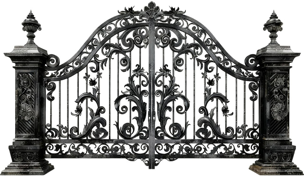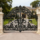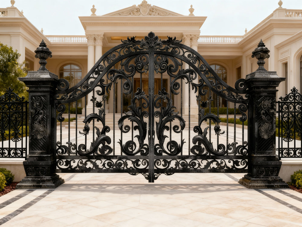 A gate that greets with grace and gravitas. Vinecrest Imperial features dual swing panels adorned with curling vines, floral medallions, and symmetrical scrollwork. The central arch lifts the composition skyward, while the flanking stone pillars and urn finials frame the gate like a ceremonial portal. This design evokes nobility, craftsmanship, and timeless prestige—perfect for entrances that must impress before a word is spoken.