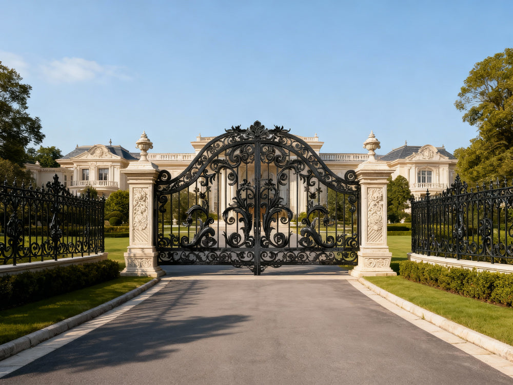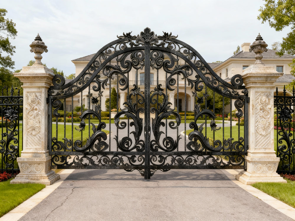 ornate iron driveway gate, decorative wrought iron gate, luxury iron gate, elegant metal gate, custom driveway gate, security iron gate, hand-crafted wrought iron gate, iron gate with scrollwork, decorative entrance gate, high-end estate gate